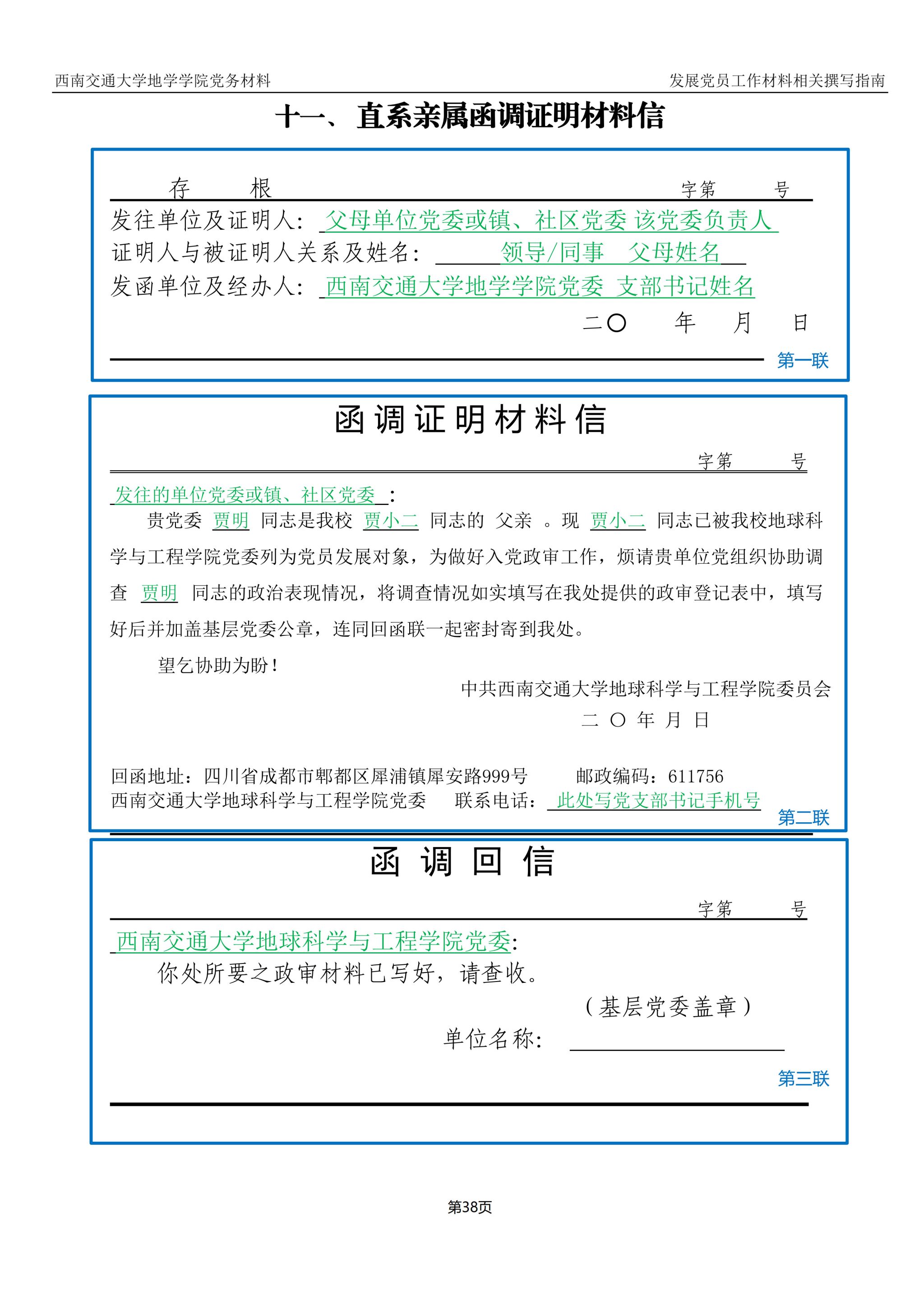 1.《函调证明材料信》一式三联,前面两联由党支部填写,填写好后由支部书记保留第一联,需要寄给亲属的为函调证明材料信第二、三联以及政审登记表,父母双方一人一份(父母某方有去世的话就不需要函调)。