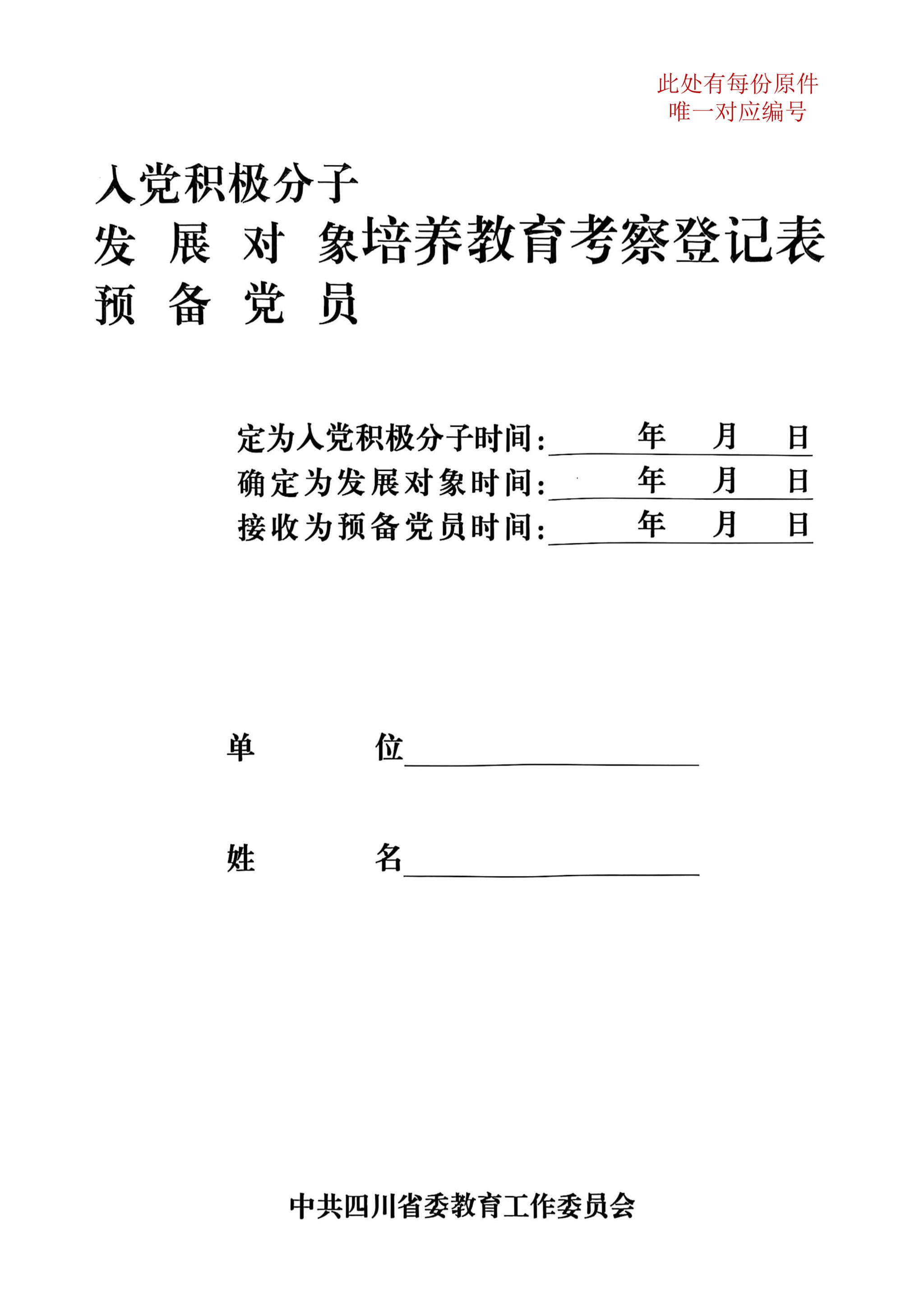入党积极分子、发展对象、预备党员培养教育考察登记表封面样例: