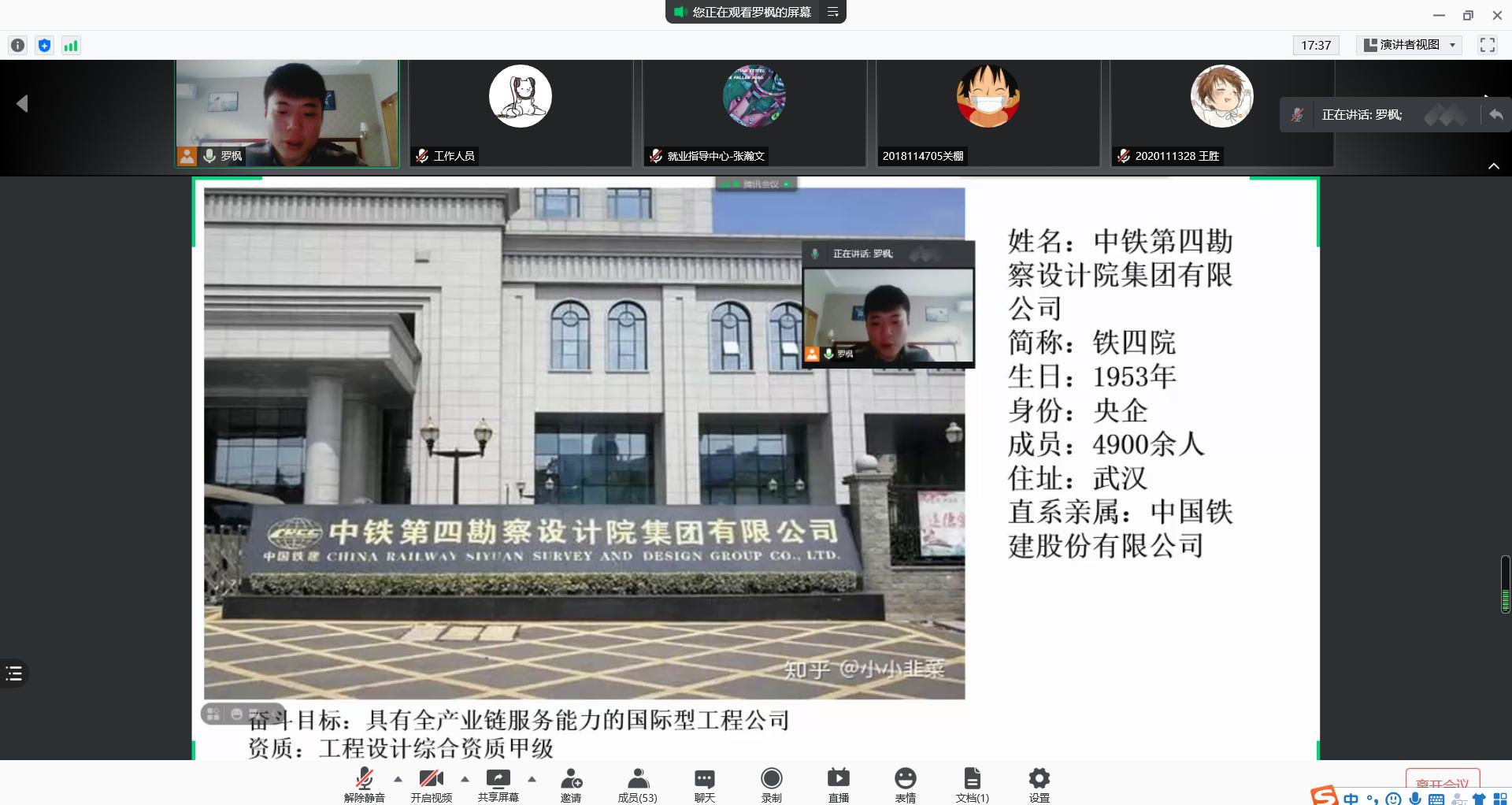 首先,罗学长从自己的工作环境入手,为我们简单介绍了“铁路四大院”各个公司的位置、特色和长处,同时以诙谐幽默的语言讲述了中铁就业的前景与优缺点,为我们建立了较为清晰的企业形象。