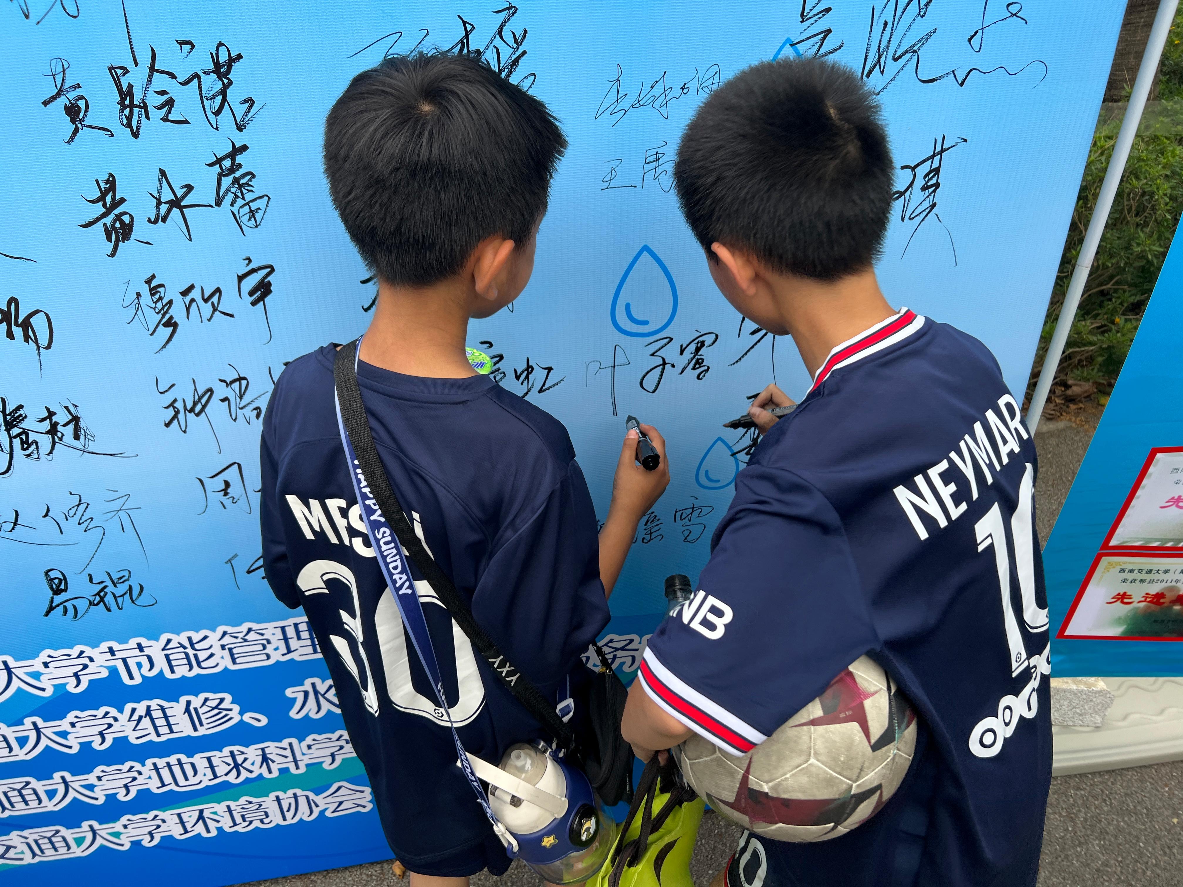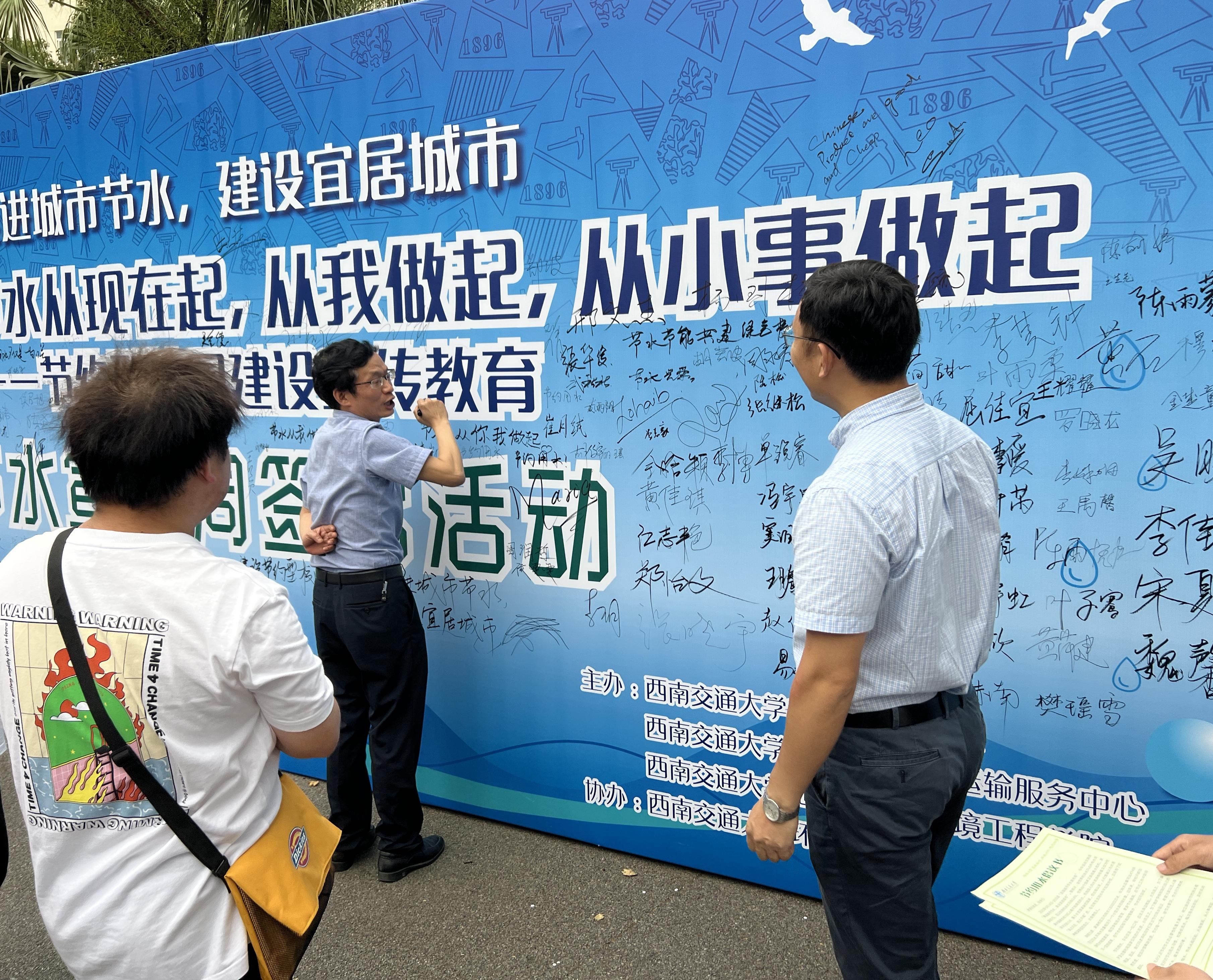 活动当天,环境协会、环保志愿者协会同学与学院2023年“菁英计划”青马工程培训班部分学员到场,协助维修、水电及运输服务中心老师发放节水宣传册,向过路师生主动宣传节水技巧,并号召大家在签名墙上留下自己的节水承诺。活动现场设置维修报修登记处和节水建议征集处,为师生开设问题解决渠道,鼓励大家共同为学校节水出谋划策,并陈列常见的节水器具和节水产品,供师生参观学习。学院党委副书记郑波老师指导并全程参与了本次活动,在签字墙下为师生宣讲节水知识,呼吁大家节水从现在做起、从小事做起、从自己做起。