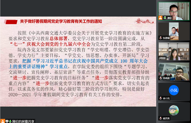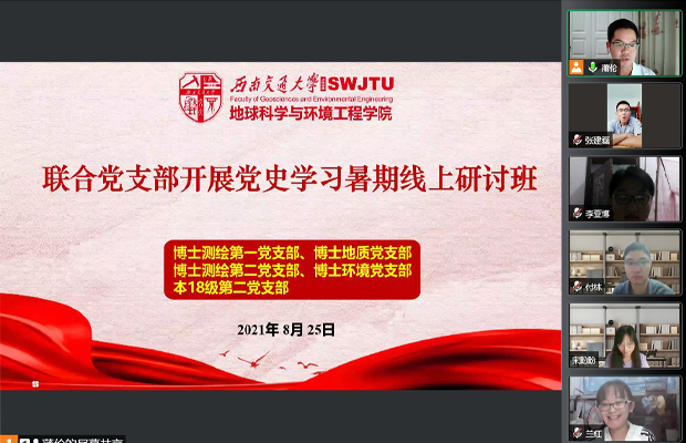联合党支部于2021年8月25日19:30在腾讯会议(ID:151 668 292)开展了党史学习暑期线上研讨班交流活动。联合党支部由博士测绘第一党支部、博士测绘第二党支部、博士地质党支部、博士环境党支部、本18级第二党支部组成。此次交流活动由博士测绘第二党支部书记蒲伦主持,联合党支部全体党员、发展对象、入党积极分子及共青团员参加。
