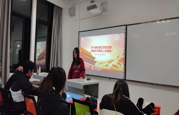 2021年10月19日晚上八点,研19级环境三班党支部于4127开展发展对象座谈会与推优入党答辩。首先开展由支部委员会组织入党积极分子身边的党员、群众开展座谈会。结合入党积极分子的现实表现(包括学习成绩、青年大学习情况、党史学习情况、入党申请书及思想汇报书写情况等),充分听取与会人员意见,征求是否同意推荐入党积极分子作为发展对象人选。