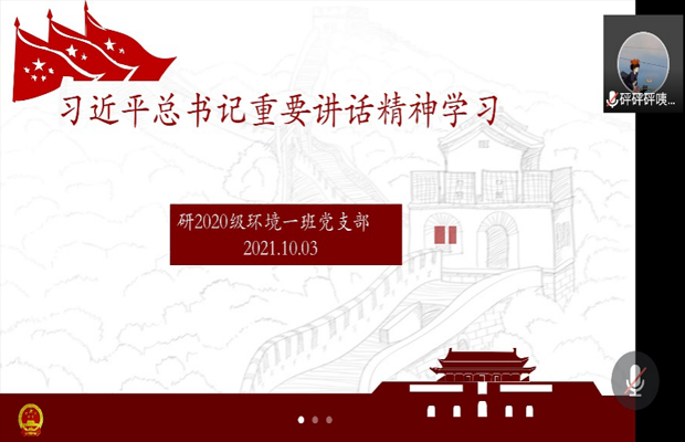 2021年10月3日星期日晚上九点,研20级环境一班党支部通过腾讯会议开展了线上组织生活会,主要内容为:学习习近平总书记在中国科学院第二十次院士大会、中国工程院第十五次院士大会、中国科协第十次全国代表大会上的讲话精神以及给《文史哲》编辑部全体编辑人员回信精神。本次组织生活会由研20级环境一班党支部书记李佳琪主持,研20级环境一班党支部全体党员、发展对象、积极分子参加。