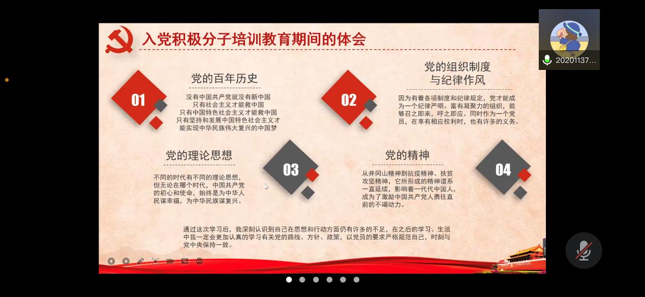 2021年11月20日晚上七点半,本科环境党支部于腾讯会议线上组织开展了推优入党答辩会。本次会议主要是进行2021-04期发展对象选拔工作,由本科环境党支部副书记仁真严木参同志主持,本科环境党支部22名党员、17名入党积极分子参与。