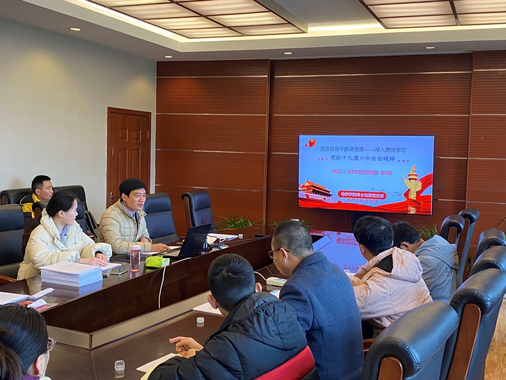 首先,赵晓彦教授带领与会党员学习了党的十九届六中全会精神,分别从认识党的十九届六中全会、认识党的十九届六中全会重要性、数读十九届六中全会公报、党的十九届六中全会的成果和贡献、学习《中共中央关于党的百年奋斗重大成就和历史经验的决议》等方面进行了深入讲解。接着,赵晓彦教授围绕一百年来党的宝贵历史经验“十大经验”,结合博士研究生科研学习中的实际问题,并从博士论文的选题、工作开展、遇到困难处理方法等具体问题出发展开了详细讨论,强调了坚持信念的重要性,总结了三个科研工作中需具有的宝贵品行:决策者的格局和情怀、执行者及执行过程中坚强的意志、践行者的不折不扣贯彻。赵晓彦教授还教导大家在面对科学问题时要善于总结,有想法,勤思考,科学研究要联系实际,具有大局观。最后,赵晓彦教授结合川藏铁路的设计、施工、运营等方面可能面临的地质问题,鼓励支部博士生党员要抓住机遇,积极面对挑战,正确运用所学知识和掌握的专业技能,以饱满的政治热情、严实的科研学习作风、良好的精神状态投身到各项工作中去。
