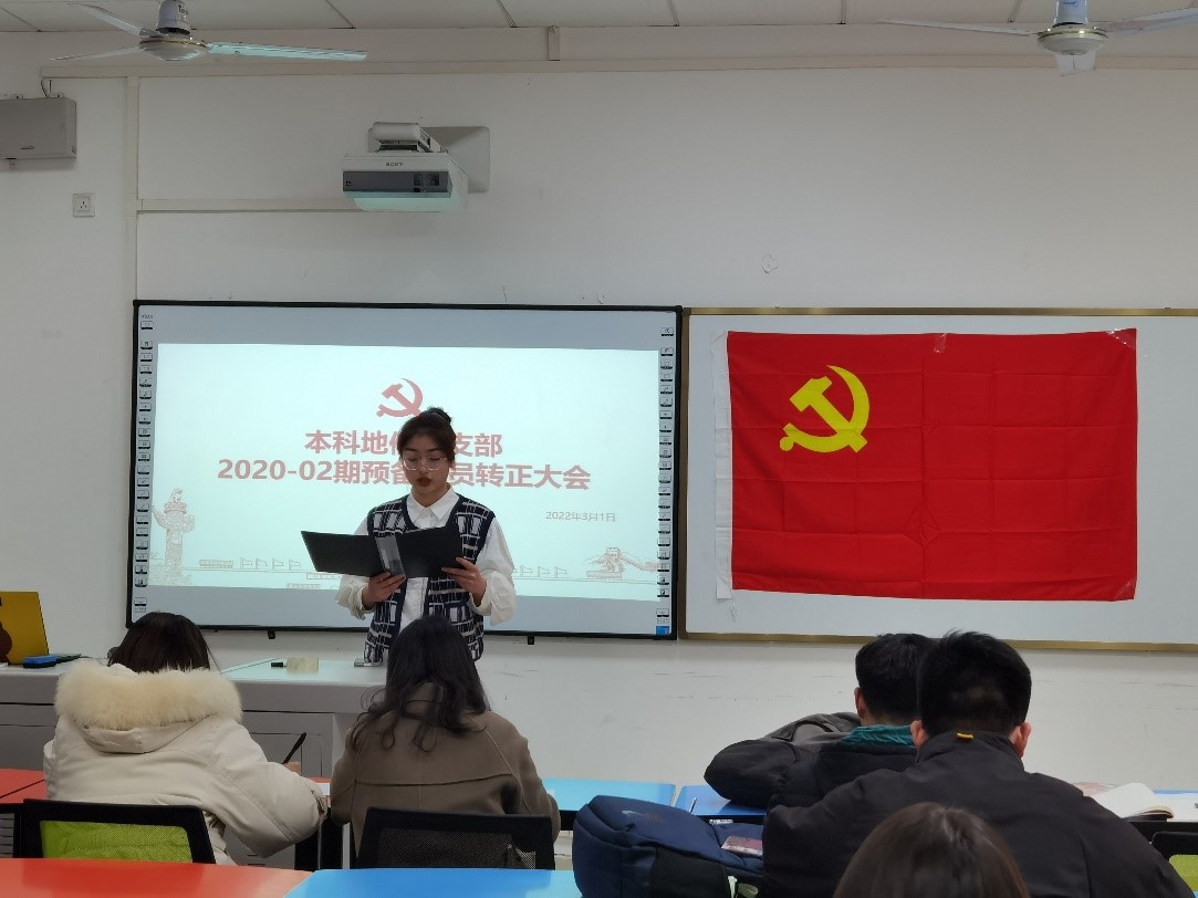 地球科学与环境工程学院本科地信党支部于X4135开展了本科地信党支部2020-02期预备党员转正大会,旨在做好2022年发展党员工作,切实提高党员发展质量,确定本支部新一批正式党员名单。