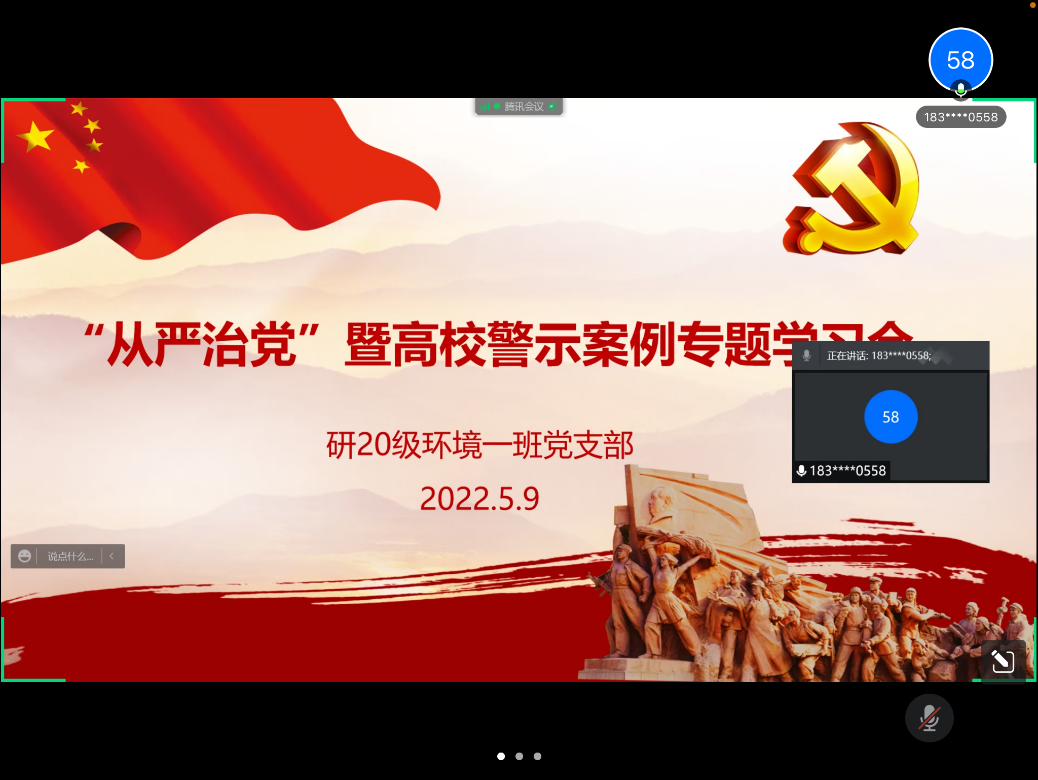 2022年5月9日星期一晚上九点,研20级环境一班党支部于腾讯会议召开“从严治党”暨高校警示案例专题学习会,主要内容为:深入学习王顺洪书记在蘑菇视频