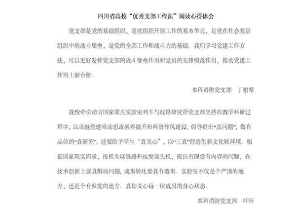 针对党的十八大以来四川省高校党支部在组织发展过程中存在的问题,2021年9月省委教育工委开展“优秀支部工作法”推荐评选活动,按照“可学习、可借鉴、可复制、可推广”的原则,择优确定了20个“优秀支部工作法”。为了更好发挥党支部的战斗堡垒作用和党员的先锋模范作用,深化支部成员对高校党建工作的认识和理解,本科消防党支部于9月23日至9月25日组织进行了《四川省高校“优秀支部工作法”》专题学习活动。本次活动由党支书高一帆同志组织,支部全体共10位党员、预备党员自行学习文件后参与线上交流并分享学习心得。