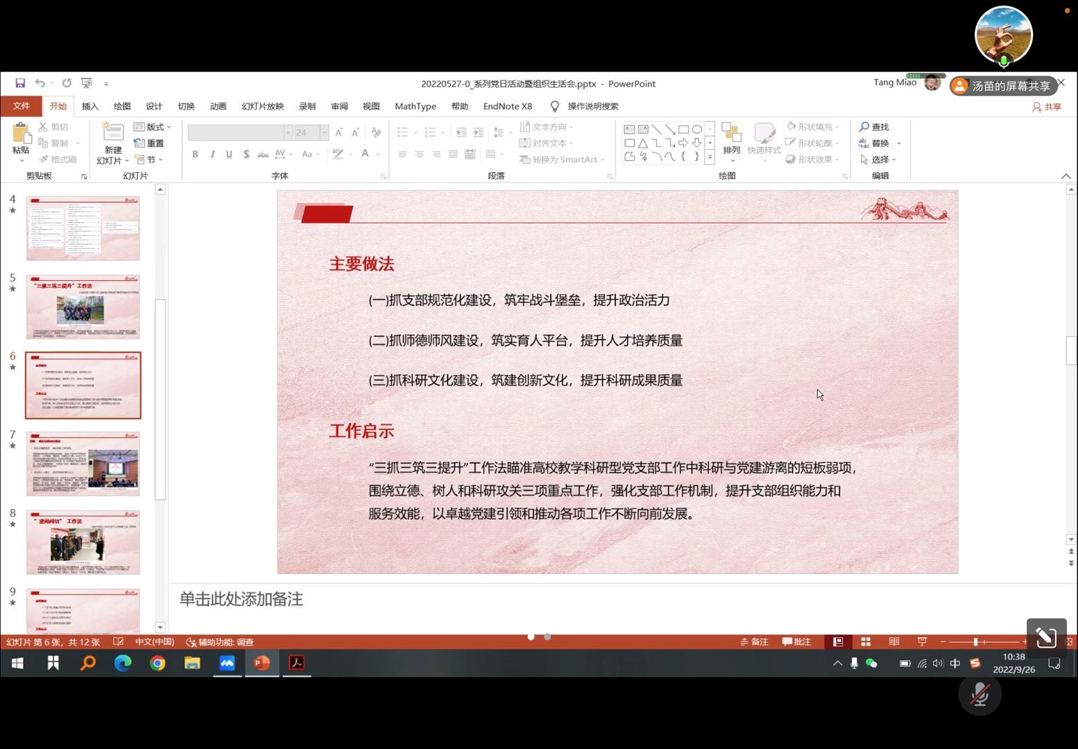 “三抓三筑三提升”工作法以及成都中医药大学“望闻问切”工作法。紧接着,汤苗带领支部成员学习了身边的优秀案例、博士党支部的优秀成果,回顾了“推行党建动车模式”及“青年博士工作室”两个案例,并温习了党支部的定义:“党支部是党的基础组织,是党组织开展工作的基本单元,是党在社会基层组织中的战斗堡垒,是党的全部工作和战斗力的基础。”