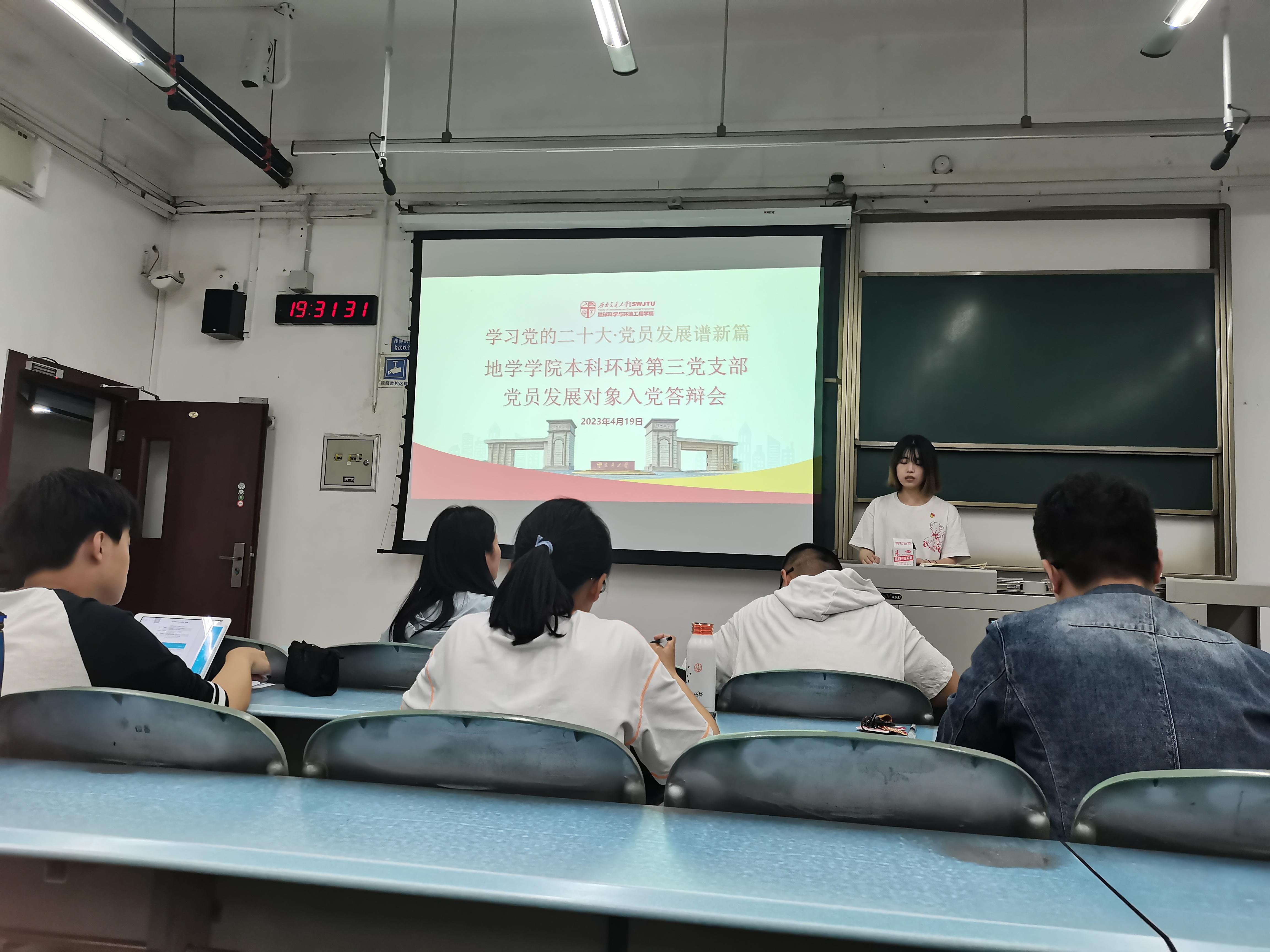 为做好2023年发展党员工作,切实提高党员发展质量。本科环境第三党支部于2023年4月19日19:30在X2333召开2023-01期发展对象答辩大会。本次大会由党支部书记钟若兰同志支持,本科环境第三党支部全体党员参与。