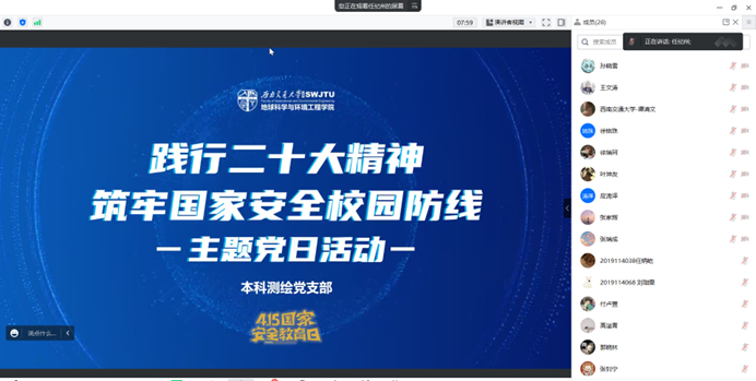 为深入学习传达学校和学院主题教育动员部署会精神,明确党支部下一阶段的工作重点方向,同时为为深入学习贯彻习近平新时代中国特色社会主义思想和党的二十大精神,深入贯彻落实学校第十五次党代会战略部署,充分发挥先进典型、模范人物的示范表率带动作用,本科测绘党支部于2023年4月27日晚19:00线上开展“践行二十大精神——筑牢国家安全校园防线”主题党日活动暨两优一先评选支部党员大会。本次活动由党支部书记任纪州主持,党支部全体党员出席本次会议。