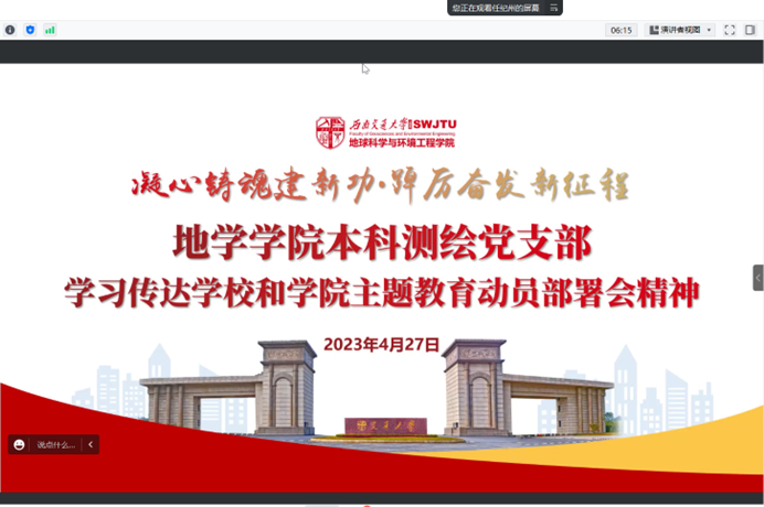 4月15日是国家安全日,为深入贯彻落实党的二十大精神,全面加强学校国家安全保密教育,强化做好新时代新征程保密工作的责任义务,切实提升学校师生国家安全保密意识和保密常识,筑牢维护国家秘密安全的校园防线,因此会议进行第二项,由任纪州同志向本科测绘党支部成员传达学校和学院主题教育动员部署会议精神。
