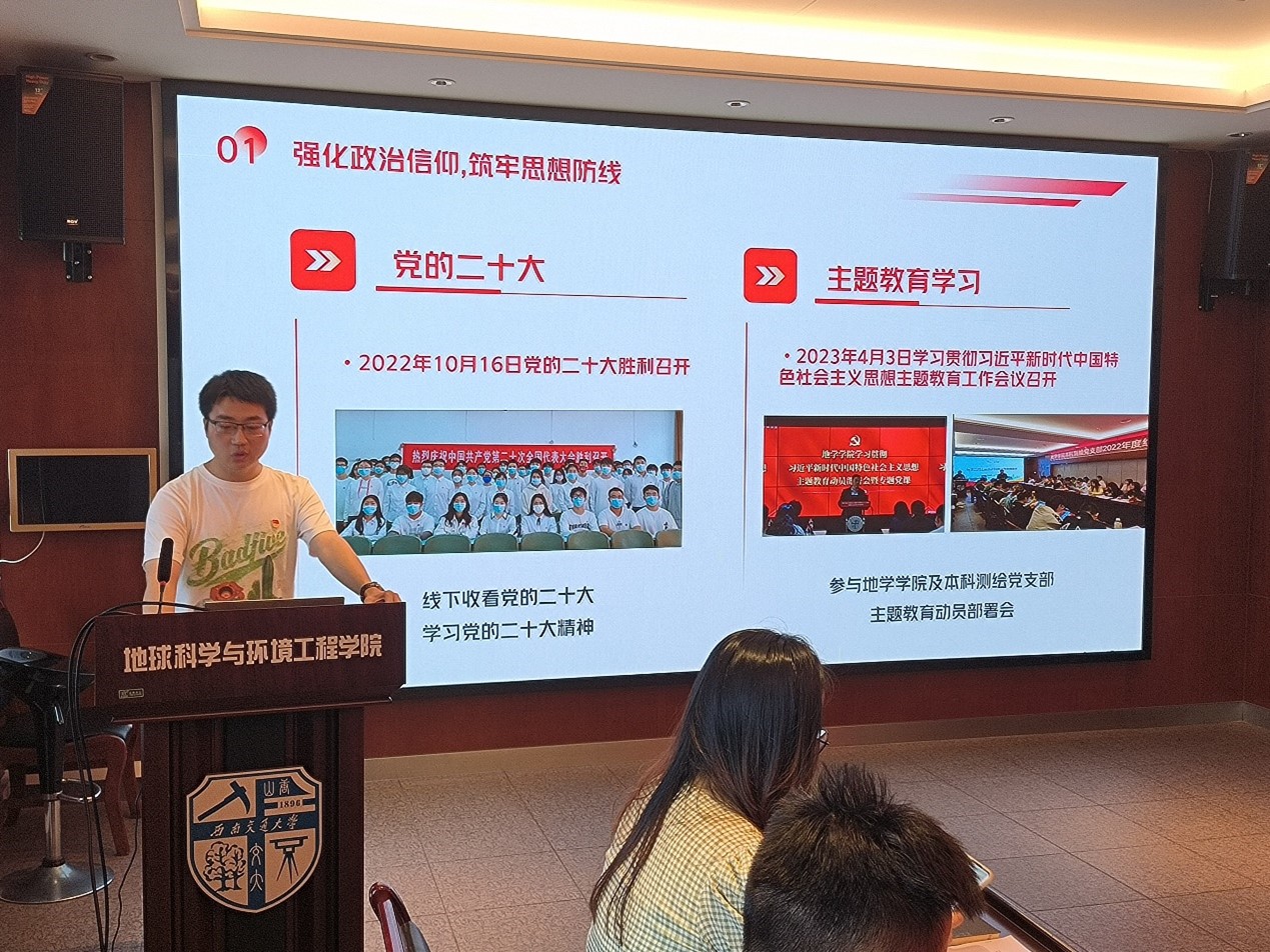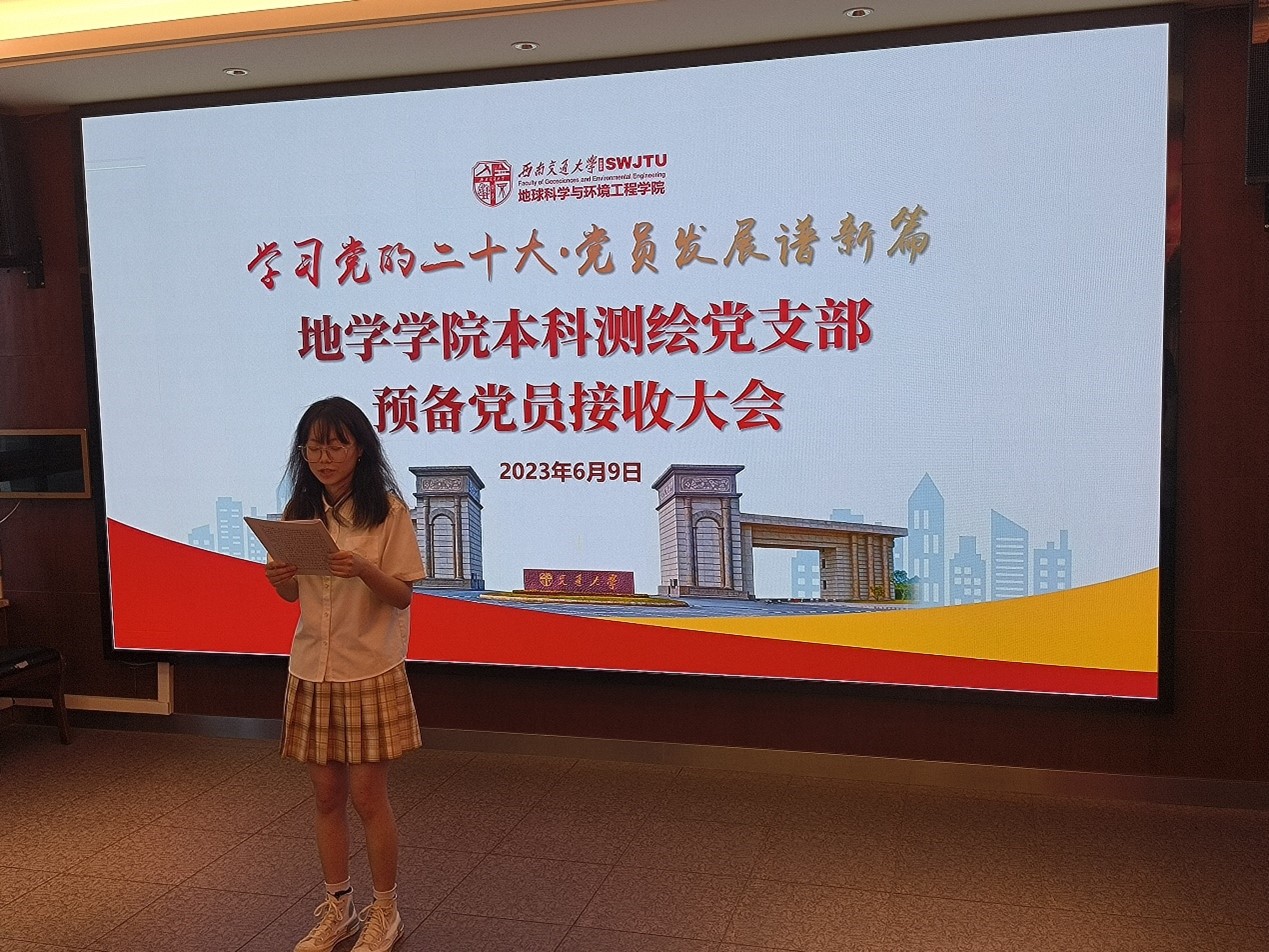 本科测绘党支部于2023年6月9日19:30在X4520召开2022-01期预备党员转正大会暨2023-01期预备党员接收大会:审议、讨论、表决关于任纪州、应涛泽2名同志转为中共正式党员以及郇江龙等7名同志接收为中共预备党员的相关事宜。转正大会由支部指导老师李婧老师主持、接收大会由本科测绘党支部书记任纪州同志主持。党支部全体党员七名发展对象出席本次会议。