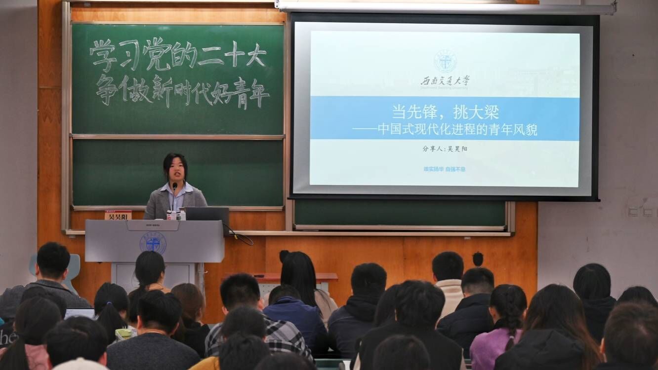 宣讲伊始,吴昊阳以《当先锋,挑大梁——中国式现代化进程的青年风貌》为题,从当代青年的心理特点出发,引用习近平总书记对青年人的寄语“厚植家国情怀、涵养进取品格,以奋斗姿态激扬青春”,结合戍边战士陈祥榕、“扶贫之花”黄文秀以及蘑菇视频