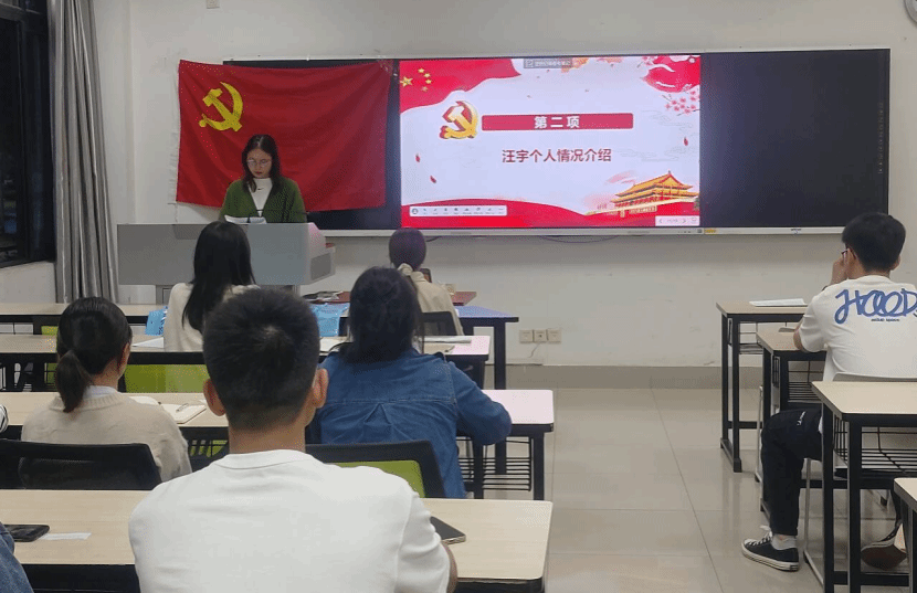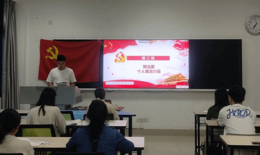 首先是对郭治豪同志进行接收。大会第一个环节,郭治豪同志讲述了自己个人的基本情况及入党动机。大会第二个环节,入党介绍人对其在递交入党申请书以来的表现进行评价。其入党介绍人任颖和冉文韬同志均表示,该同志在递交入党申请书以来,入党动机明确,态度端正,认真学习,积极参与志愿服务,但在处理问题时稍显急躁,有待提高。两位同志最后一致认为郭治豪同志已基本具备共产党员条件,可接收为预备党员。