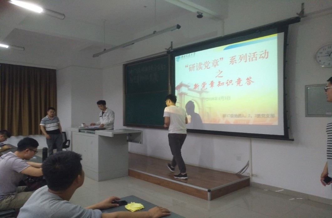 201843日晚21:00,研2017级地质一班党支部与地质二班、地质三党支部在犀浦校区X9239教室召开学党章 修党性研读新党章活动。本次学习活动采用室内知识竞答方式:地质一班书记李志浩、地质二班支部书记何江、地质三班支部书记袁彬主持活动。三个班支部全体党员以及17级地质专业全体积极分子参加。