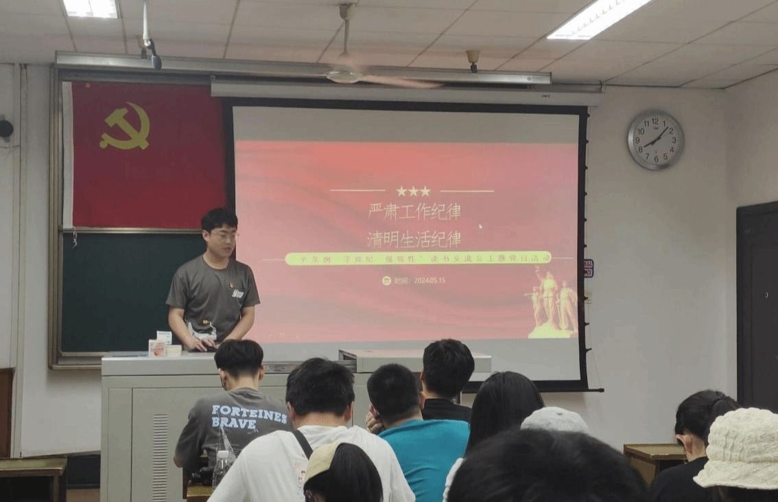 随后,谢詹同志分享了他们小组在廉洁纪律和工作纪律两个方面的学习收获,总结了廉洁自律不仅是对个人品行的锤炼,更是对党忠诚的体现;而密切联系群众,则是党的根本工作路线,是我们党始终赢得人民支持和信任的关键所在。通过对张洪亮和魏田双等人的案例的分析解读,为同学们带来了一场生动切实的党纪教育。最后播放的廉洁警示教育片也让支部成员认识到贪腐只在一念之间,党员同志必须加强自我约束,主动接受监督,做到心中有戒、行有所止。