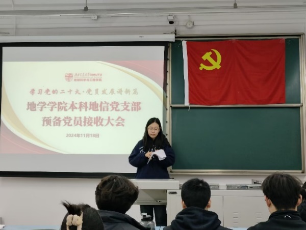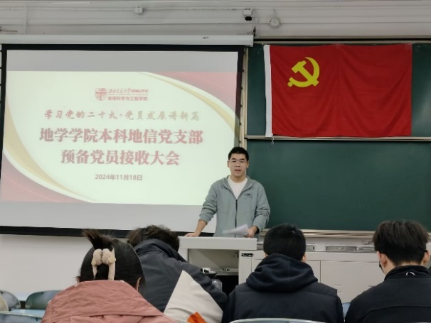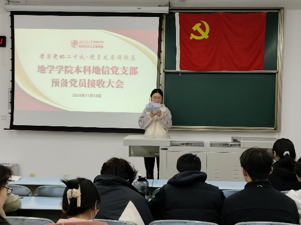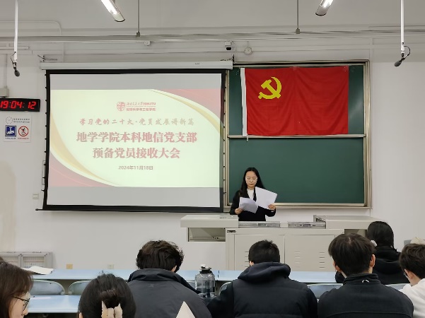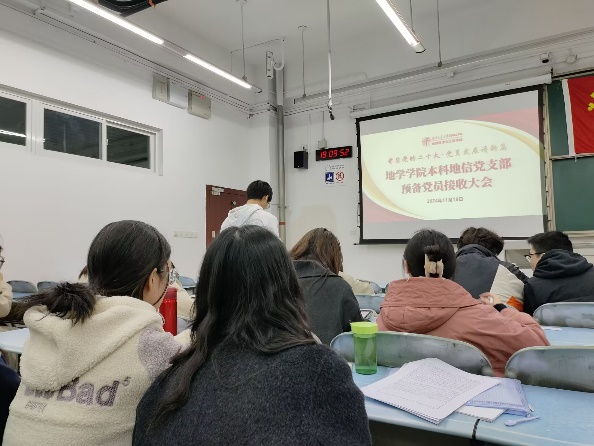 本科地信党支部于2024年11月18日晚上19时00分在X2331召开2024-02期预备党员接收大会,本次大会的议题:讨论是否同意接收黄龄诺、石嘉馨、王艺诺、张智睿4名同志为预备党员。本次大会由候王悦同志主持。