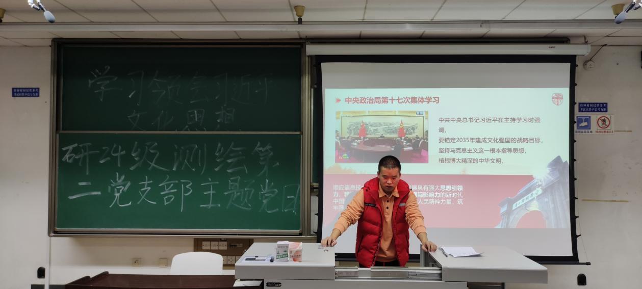 2024年11月15晚上,研24级测绘第二党支部在J4319教室,开展了以“学习领会习近平文化思想”为主题的党日活动。本次活动旨在深入学习和贯彻习近平新时代中国特色社会主义思想,特别是习近平总书记关于文化建设的重要论述,进一步增强党支部成员的文化自信和精神力量。