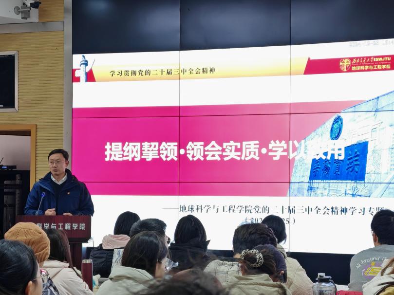 本科测绘、地信、遥感党支部于2024年12月25日下午16时,在犀浦校区X4243教室联合举办了题为“提纲挈领·领会实质·学以致用”的主题党课。此次党课由学院党委副书记、纪委书记郑波同志担任主讲,本科测绘、地信、遥感党支部的党员同志们积极参与学习。