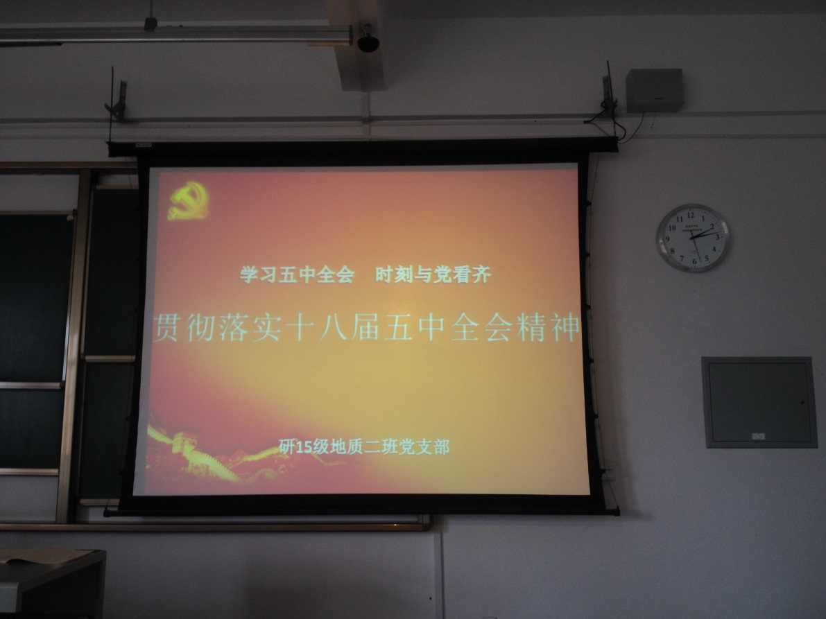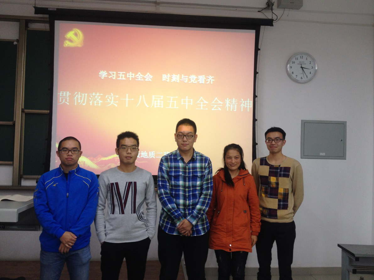中国共产党第十八届中央委员会第五次全体会议,于2015年10月26日至29日在北京召开。为了积极响应学院党组织的号召,充分调动广大大学生党员的积极性和创造性,保持共产党员的先进性,充分发挥共产党员的先锋模范作用,提高学生基层党组织的创造力、凝聚力和战斗力,2015年11月17日地球科学与环境工程学院2015级研究生地质工程二班党支部开展了以 “学习五中全会,时刻与党看齐”为主题的党日活动。