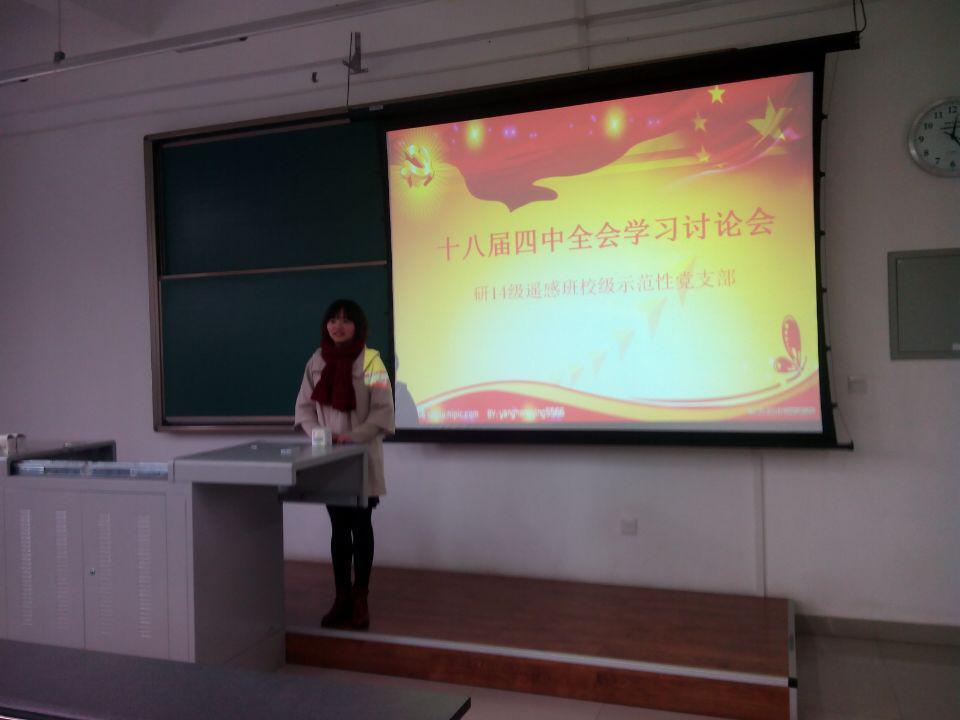 研14级遥感班校级示范性党支部分别于2014年11月27日、12月6日、12月18日举行十八届四中全会学习讨论会、《习近平总书记党的群众路线教育实践活动总结大会上的讲话》学习讨论会以及“慵懒散浮拖”专项整治讨论会。此次专题交流活动吸引三十余名同学参与其中。