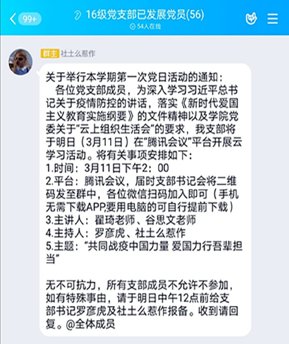 本科2016级联合党支部于2020年3月11日14:00召开了以“共同战疫中国力量,爱国力行吾辈担当”为主题的云上组织生活会。此次云上组织生活会选用腾讯会议平台,主讲人为翟琦老师和谷思文老师,主持人为罗彦虎同志和社土么惹作同志。