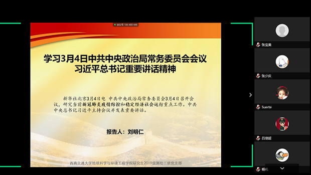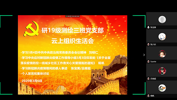 研究生2019级测绘三班党支部在腾讯会议平台召开主题为“共同战疫中国力量,爱国力行吾辈担当”的云上组织生活会。会上,支部三名党员分别带领大家学习理解习近平总书记最新重要讲话精神、中央最新出台的关于防控疫情工作的措施和抗疫期间的动人故事,增进支部成员对目前党和政府疫情防控和稳定经济社会工作的了解,激发支部成员的爱国主义奋斗精神。支部4名党员和3名入党积极分子参加会议,会议由支部书记刘明仁主持。