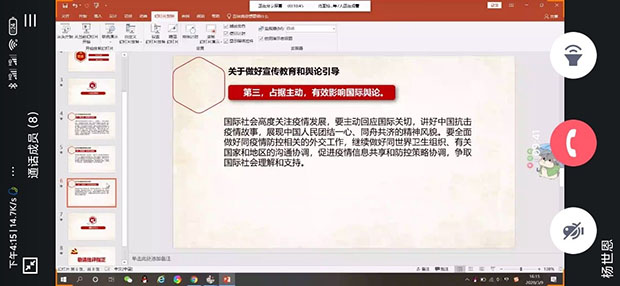 会议开始,党支部书记杨世恩同志为支部党员讲解宣传了疫情相关情况、中央的系列讲话精神。重点传递党中央关于做好宣传教育和舆论引导方面的内容。第一,强化显政,坚定战胜疫情信心。第二,把握主导,壮大网上正能量。第三,占据主动,有效影响国际舆论。在党中央集中统一领导下,在各方面共同努力下,防控工作正有力开展,社会各界和国际舆论反映总体是好的。习近平同志在会见世界卫生组织总干事谭德塞时,谭德塞表示,中方行动速度之快、规模之大,世所罕见,这是中国的制度优势,有关经验值得其他国家借鉴,相信中国采取的措施将有效控制并最终战胜疫情。随后支部书记从爱国力行担当方面进行了相关讲解教育。