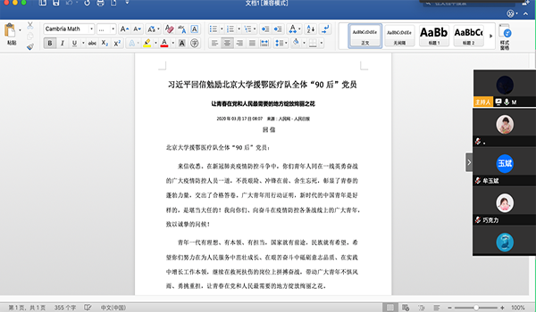 2020年3月15日,习近平总书记给北京大学援鄂医疗队全体“90后”党员回信,高度赞扬了北京大学援鄂医疗队的青年党员在疫情防控斗争的一线不畏艰险、冲锋在前、舍生忘死、交出合格答卷的精神,充分肯定新时代的中国青年是好样的,是堪当大任的。按照学院,研17级环境三班党支部于5月6日通过腾讯会议开展学习贯彻“习近平总书记重要回信精神加强新时代高校青年党员队伍建设”云上组织生活会。