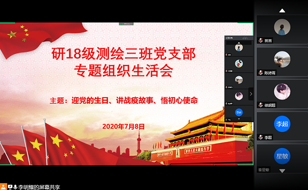研18级测绘三班党支部通过网络会议的形式开展了“四个一”行动中的“一次专题组织生活会”。会议的主题是“迎党的生日、讲战疫故事、悟初心使命”。