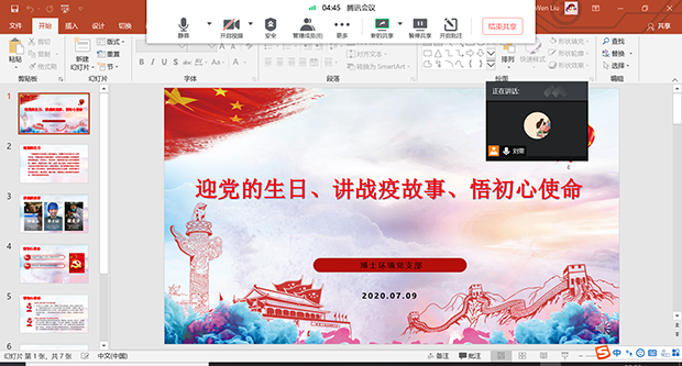 关于在常态化疫情防控中加强基层党建“四个一”行动的实施方案》(以下简称“四个一”行动)要求,在中国共产党99周年华诞之际,结合学院实际,2020年7月9日,地学博士环境党支部在腾讯会议上召开了以“迎党的生日、讲战疫故事、悟初心使命”为主要内容的微党课。分享宣传弘扬抗疫一线基层党组织和广大党员干部担当使命、勇毅逆行的先进事迹和精神风貌,鼓舞党员对标先进典型,争做模范党员,为学校以及学院的改革事业发展不断贡献力量。