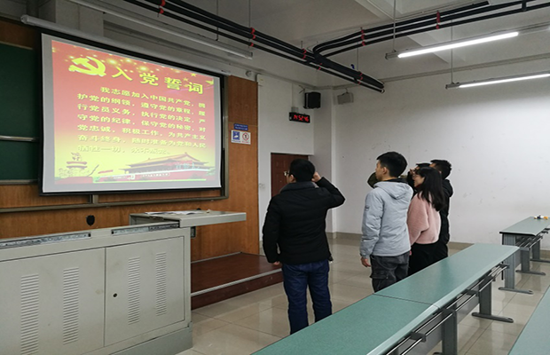 会议第三项是由支部书记带领今天转正的和新发展的三位同志进行入党誓词的宣读。
