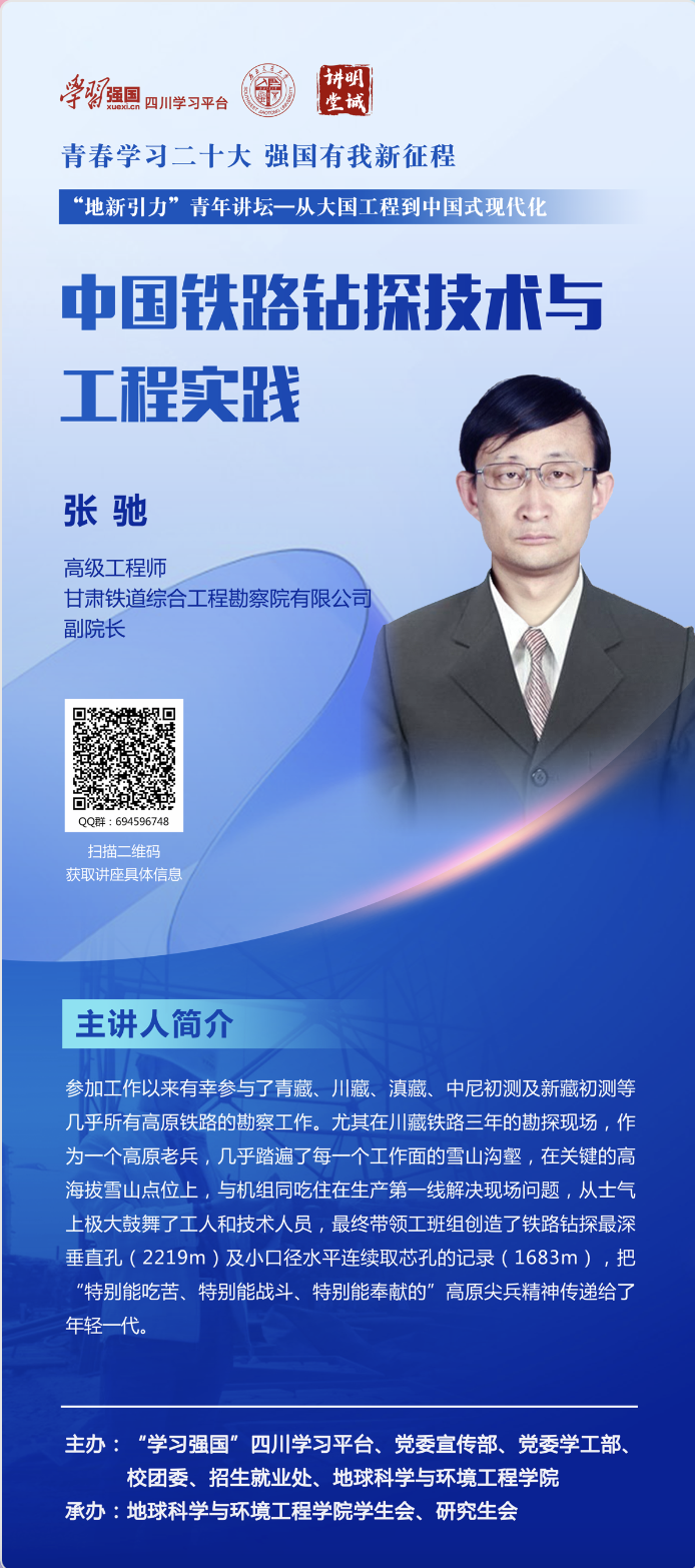 在“学习强国”四川学习平台、党委宣传部、党委学工部、校团委以及招生就业处的支持下,邀请了大国工程一线以及思想政治教育与人文社科领域的专家、学者、教授为主讲嘉宾,通过“地新引力”青年讲坛的方式,为青年学生解惑授业、增知识、长才干,号召广大学生立志做有理想、敢担当、能吃苦、肯奋斗的新时代好青年。“地新引力”青年讲坛——“从大国工程看中国式现代化”专题三讲座将于2023年5月11日举行,现就相关通知如下: