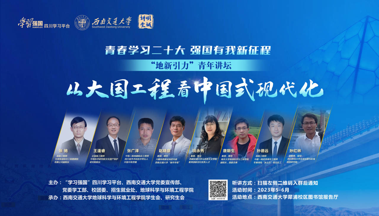 在“学习强国”四川学习平台、党委宣传部、党委学工部、校团委以及招生就业处的支持下,邀请了大国工程一线以及思想政治教育与人文社科领域的专家、学者、教授为主讲嘉宾,通过“地新引力”青年讲坛的方式,为青年学生解惑授业、增知识、长才干,号召广大学生立志做有理想、敢担当、能吃苦、肯奋斗的新时代好青年。“地新引力”青年讲坛——“从大国工程看中国式现代化”专题八讲座将于2023年5月25日举行,现就相关通知如下: