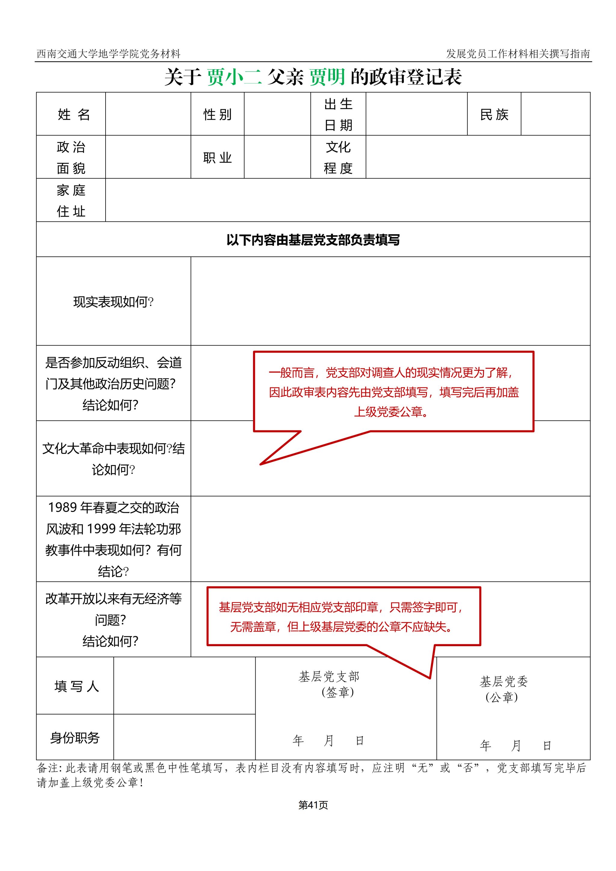 2.父母有工作单位的,让父母拿去单位党组织,让单位党组织直接填写政审登记表(需加盖单位党委章,而非公章),并写好函调回信(需加盖单位党委章,而非公章),再按照第二联学院地址寄回(收件人和收件电话填写各自党支部书记的收件信息)。