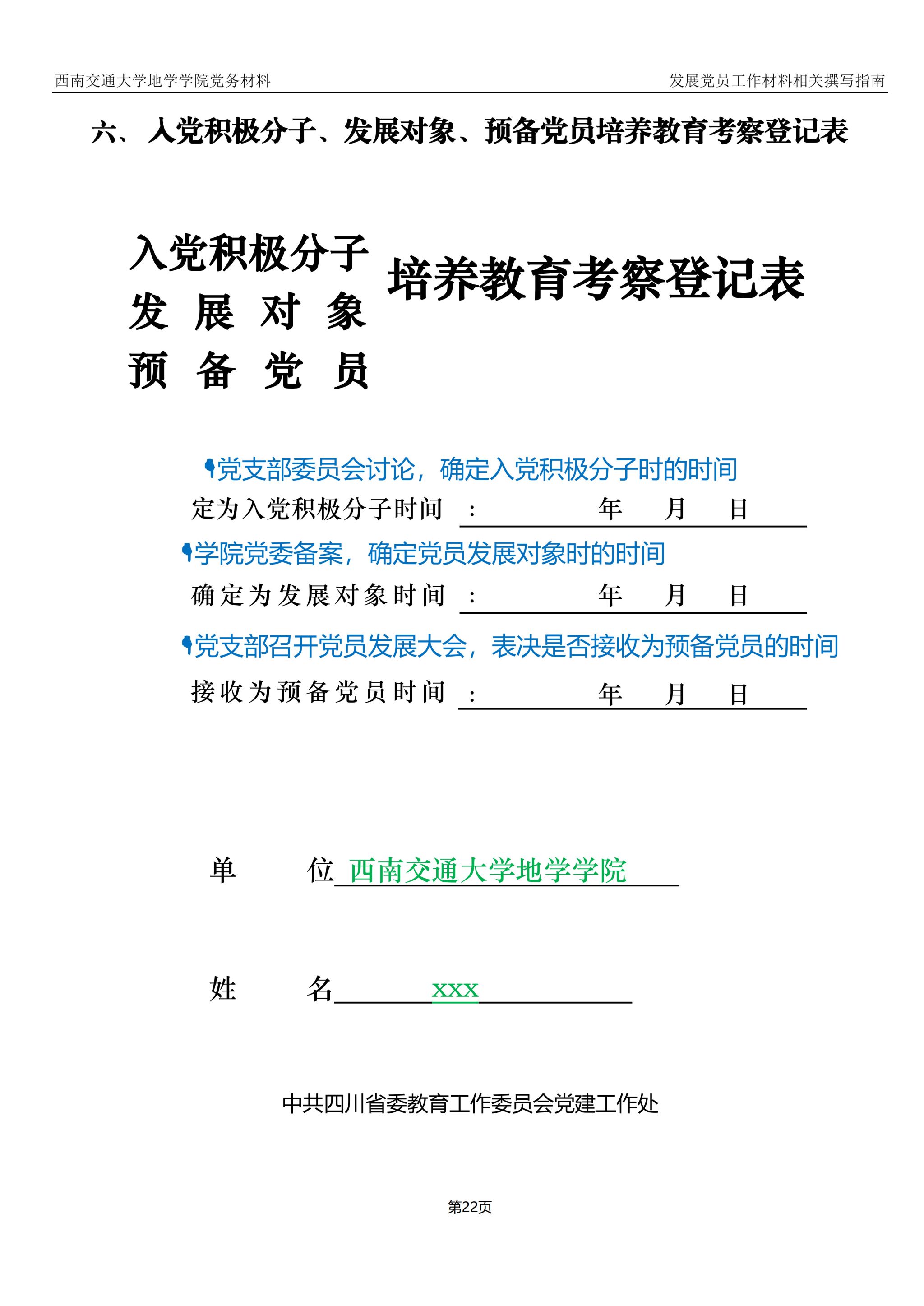 入党积极分子、发展对象、预备党员培养教育考察登记表封面样例: