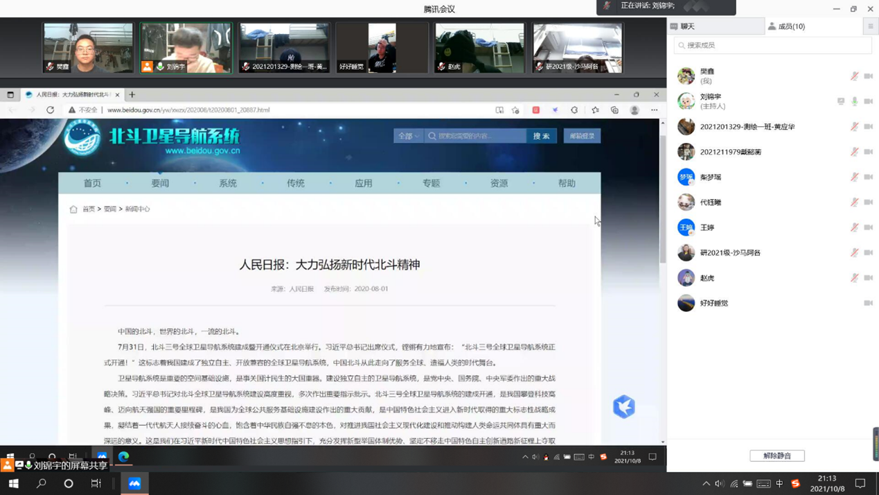 10月8日晚,北斗导航定位研究团队举办了“以爱国之心,承时代使命” 为主题的爱国情怀和思想政治建设活动。本次活动由队长刘锦宇主持。