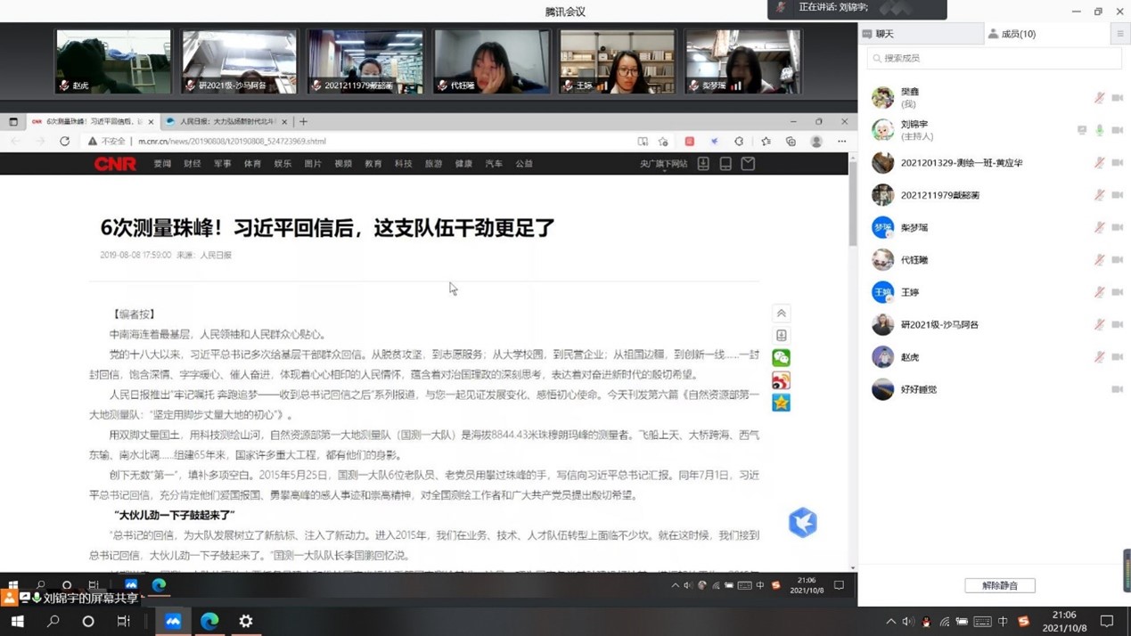 队长刘锦宇表示:通过学习党史与习近平总书记“七一”重要讲话精神,他深刻的理解到深入学习宣传贯彻习近平总书记“七一”重要讲话精神,是当前和今后一个时期一项重大政治任务,是党史学习教育核心内容,需要持续推进、不断深化。北斗导航定位研究团队应切实把思想行动统一到讲话精神上来,同心同德、斗志昂扬奋进新征程、建功新时代!向测绘行业为国奉献的老前辈学习,不怕牺牲,不惧挑战,继往开来为国家的发展做出测绘人的贡献。
