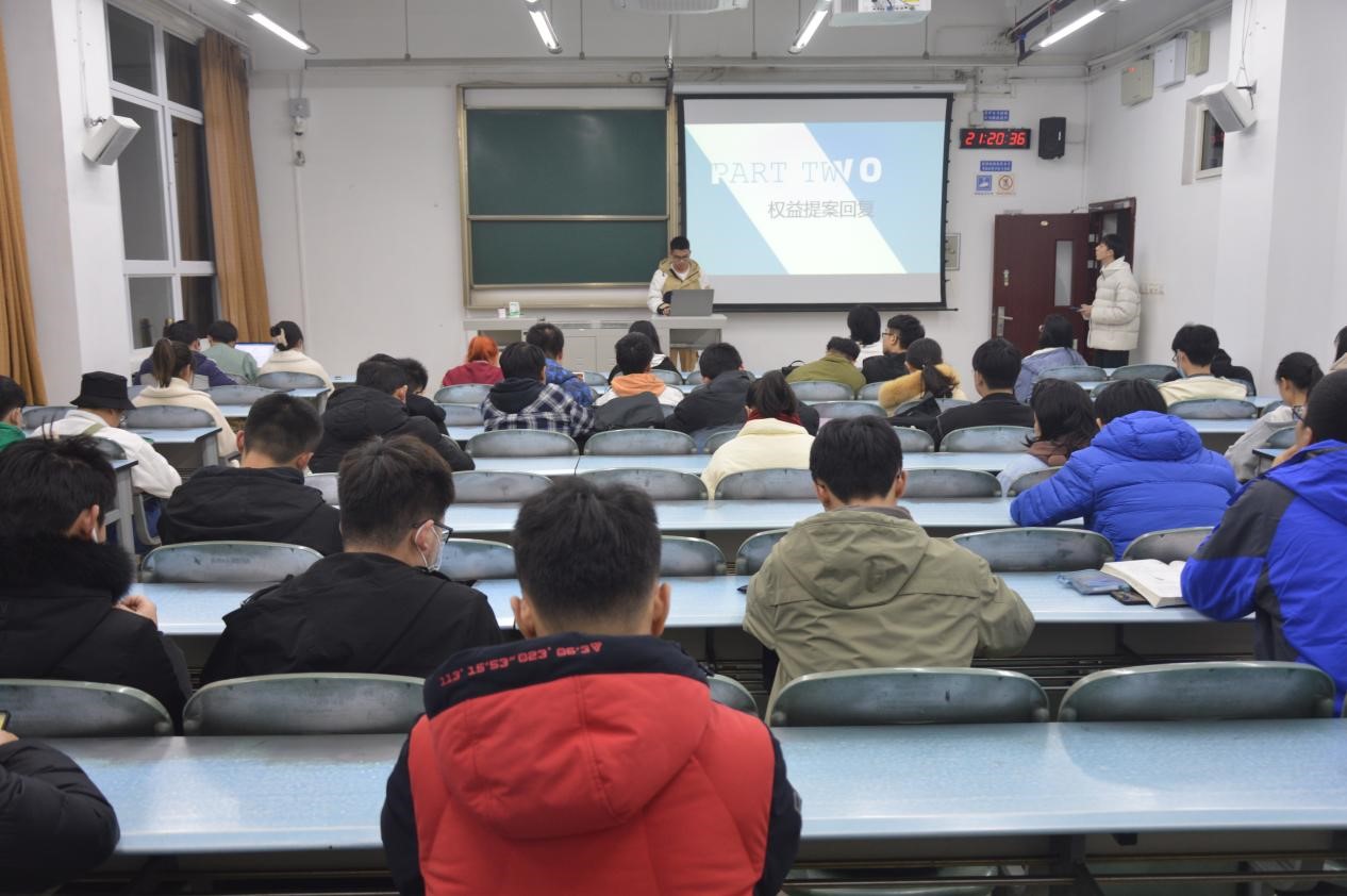 陈婧对本次权益大会作总结发言。陈婧指出本次大会目的是为了解决同学们在学校中遇到的问题,满足同学们的生活需求,打造一个更加舒适的校园环境。