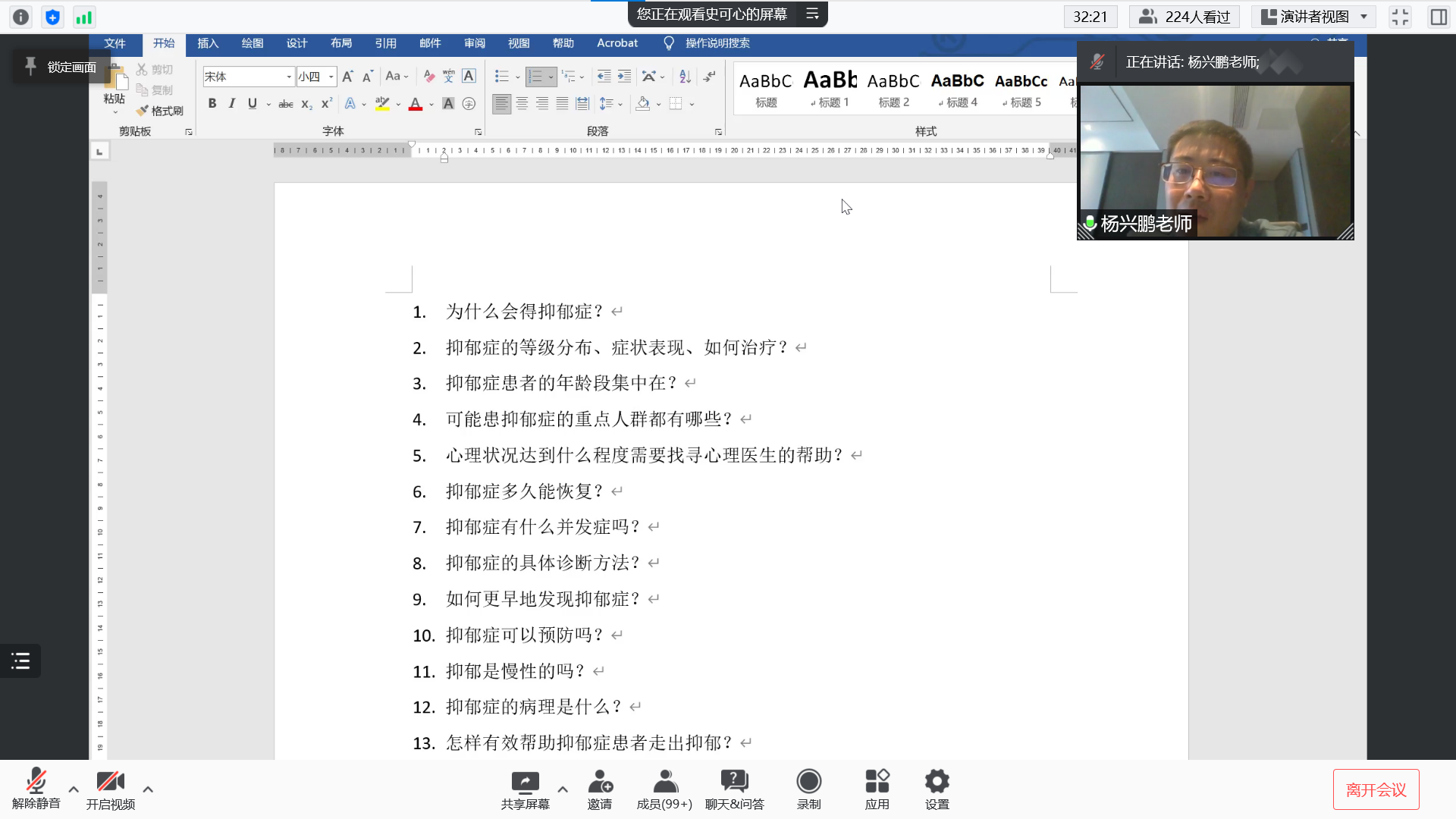 于12月9日下午16:00,采用线上腾讯会议的形式,组织开展了“走进心理学”系列心理健康教育之“‘抑’问一答”活动。本次活动由心理研究与咨询中心的杨兴鹏老师主讲。