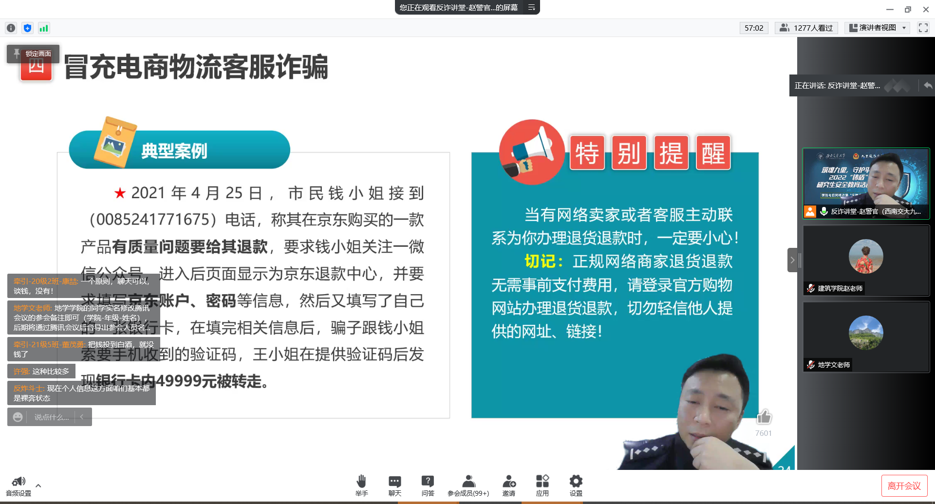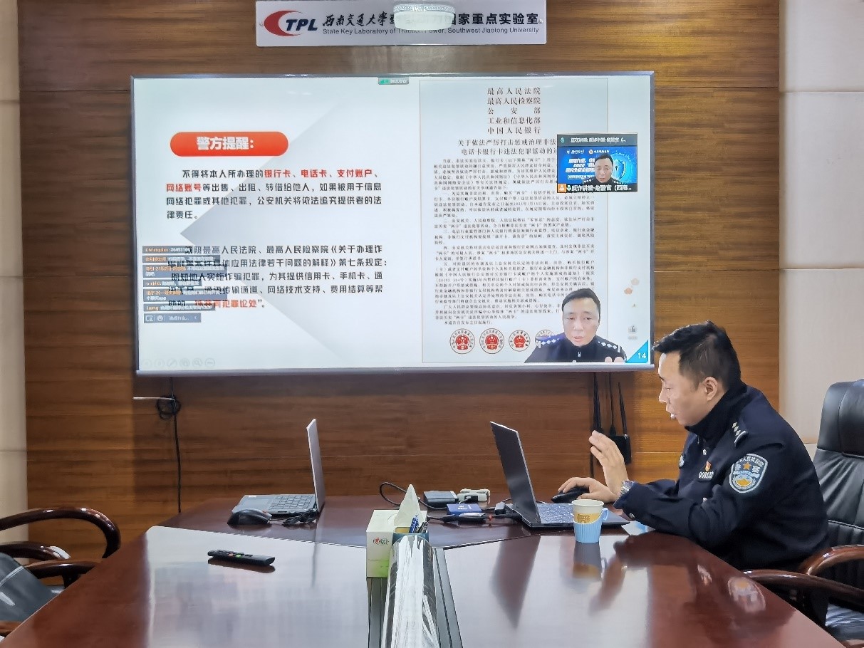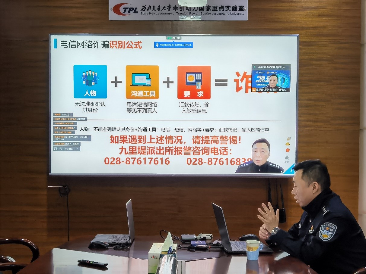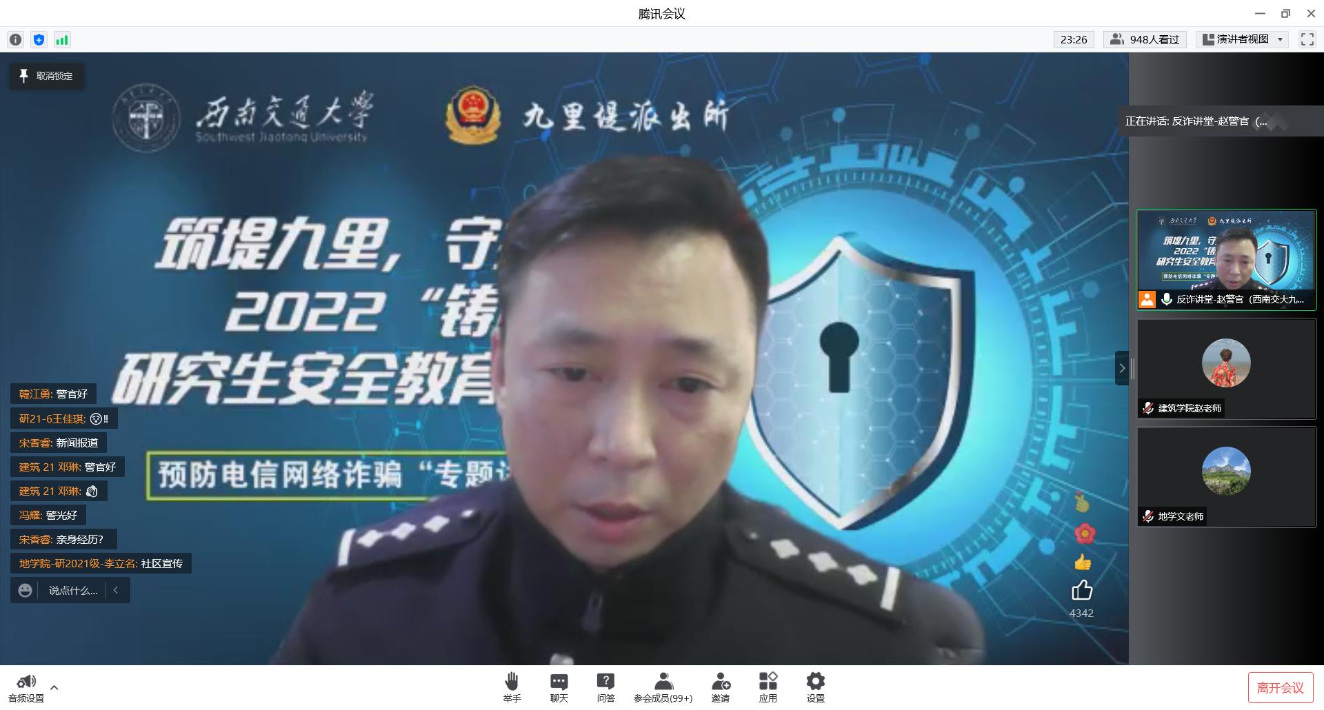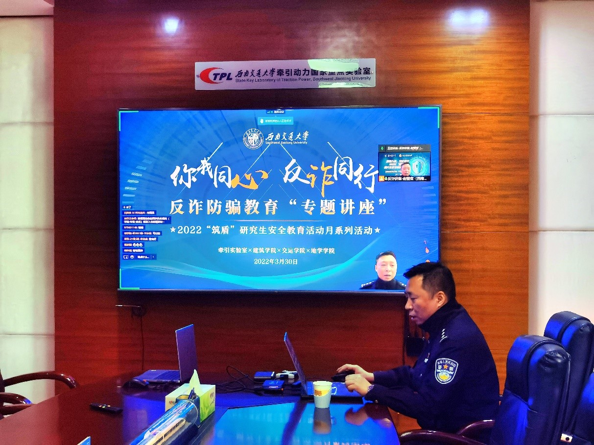 联合牵引动力实验室、建筑学院、交运学院共同举办了“你我同心 反诈同行”——反诈防骗教育“专题讲座”。根据疫情防控需要,本次讲座通过腾讯会议线上召开,特邀九里堤派出所赵磊警官担任主讲人,蘑菇视频