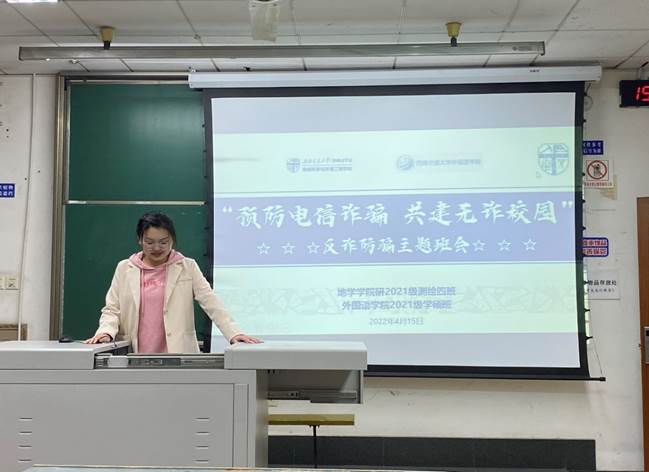 地球科学与环境工程学院研21级测绘4班与外国语学院研21级学硕班在J4521教室共同开展了以“时时讲安全,事事讲安全,防患于未然”为主题的安全教育活动。