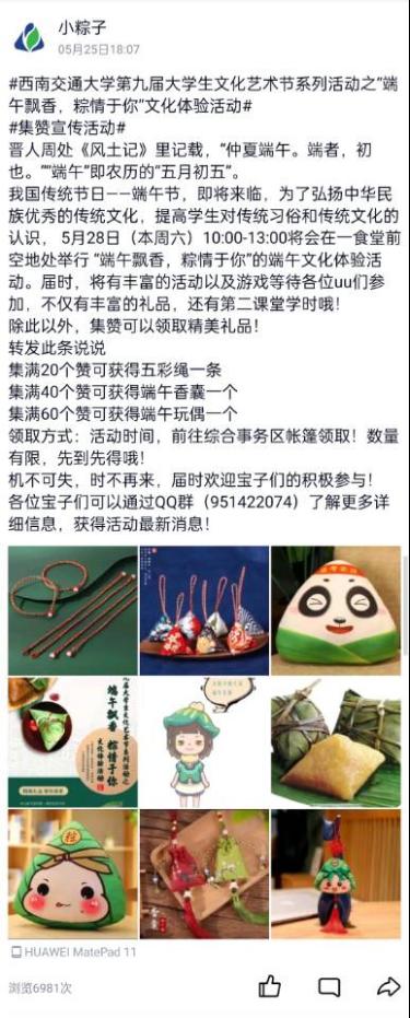 综合素质提升中心QQ运营号)发来的第九届大学生文化艺术节系列活动之“端午飘香,粽情于你”文化体验活动集赞宣传“引爆”QQ空间,同学们纷纷参与集赞,活动累计浏览量近7000次,为正式活动拉满氛围感。