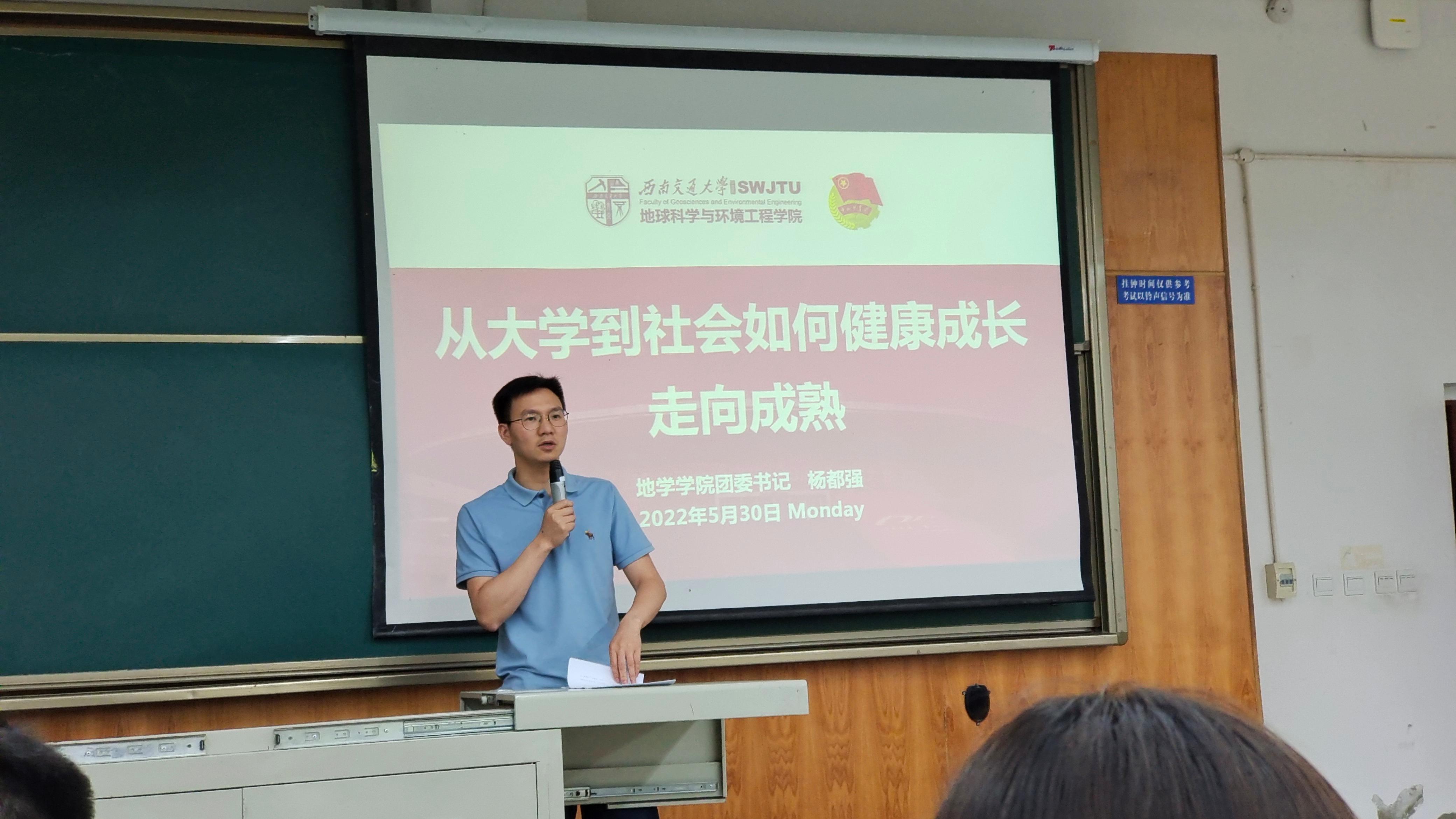 为帮助2022届大四毕业生准确有效地把握未来的就业方向,尽快地在思想、行动上做好准备,指导毕业生走好从大学走向社会的重要一步。6月17日,由地球科学与环境工程学院团委书记杨都强主讲的“从大学到社会如何健康成长走向成熟”讲座在我校犀浦校区X4151成功举行,讲座主要围绕大学生步入社会后的思想和心理建设展开,参会人员从中获得了不少宝贵的经验。