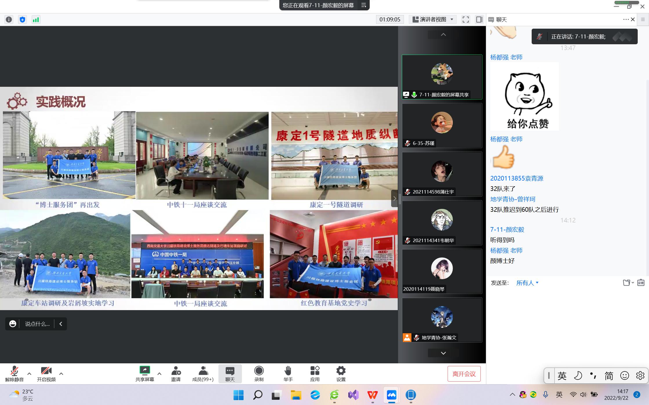 其中前往中铁十一局和中铁十二局的实践93队代表胡佳慧同学向大家展示了川藏铁路建设一线的现状以及他们团队将实践与专业融合,深挖红色底蕴后的收获。
