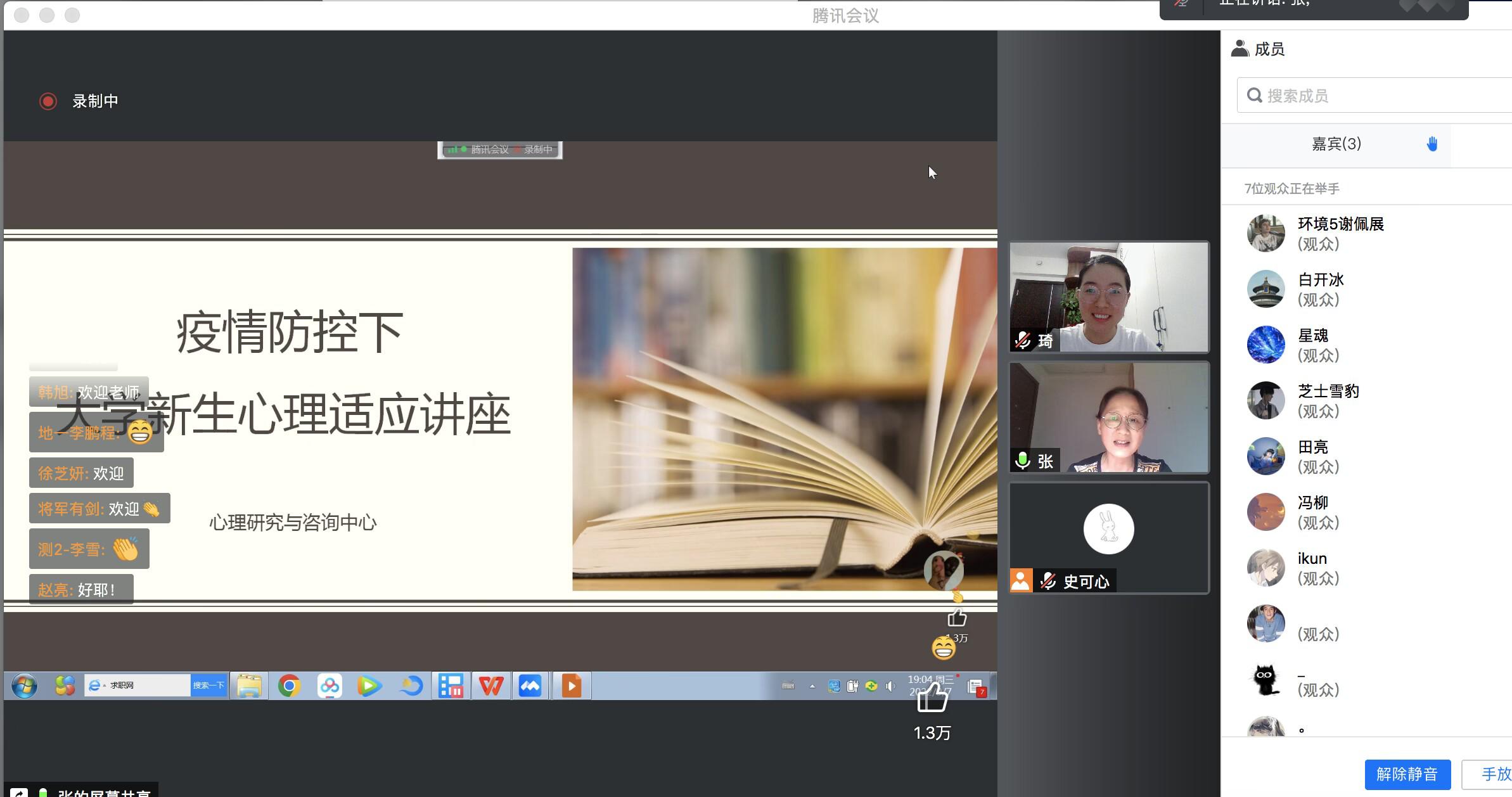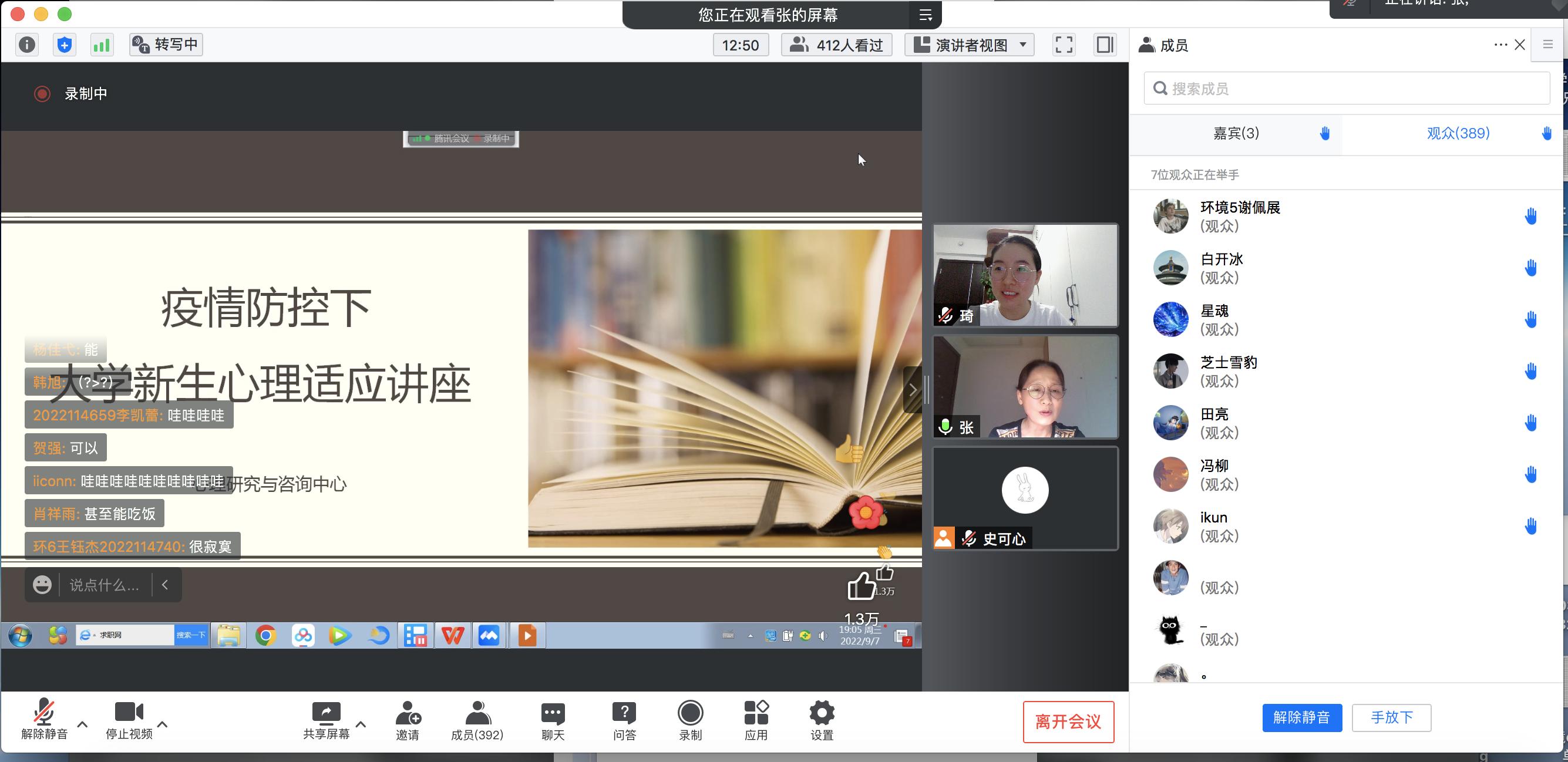 通过腾讯会议举办了以“阳光心态,幸福人生”为主题的大学生心理健康教育讲座。本场讲座由心理研究与咨询中心的张涛老师主讲,分管学院心理工作的史可心老师主持,2022级本科生辅导员翟琦老师和2022级全体本科新生参加。