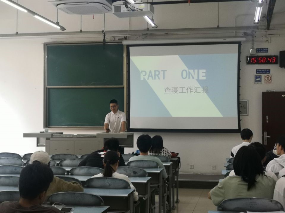 会议伊始,学生会权益服务部部长杨伊涛就开学以来的查寝工作进行汇报,就近期收集的提案进行回复和解答。