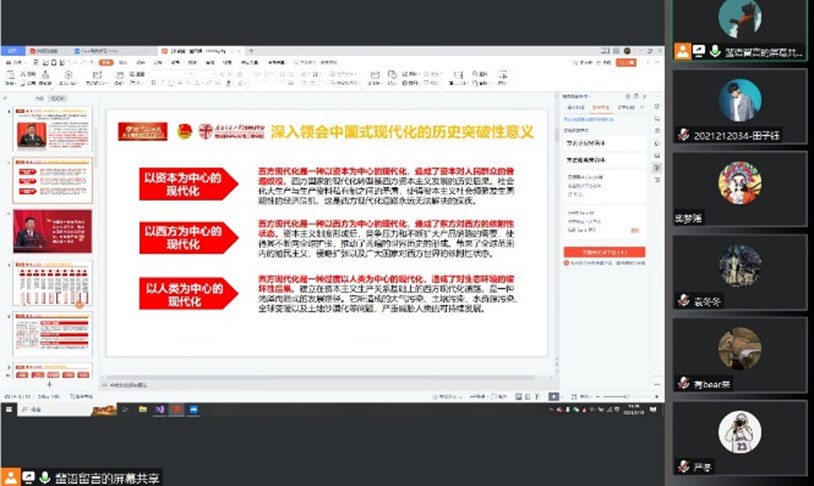 研2021级测绘第三团支部以线上学习的方式开展了本次主题班会,以继续学习二十大内容思想为基础,通过班级同学以及师兄师姐相互致辞、交流的方式开展。深入地阐述了中国式现代化的科学内涵、中国特色、本质要求和重大原则,并发表主题演讲将中国式现代化特点与当代年轻人的责任结合展开讨论,探讨如何拓展眼界和知识范围为祖国的现代化建设添砖添瓦。