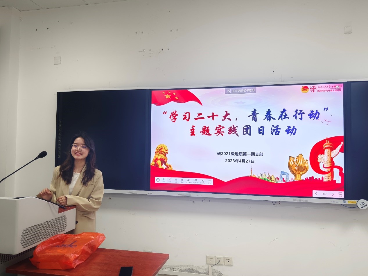 本2022级地质第一团支部在本次主题实践团日活动中,邀请了红路学讲团的成员于佳琪为同学们进行专题讲座。于佳琪将二十大的内容与同学们的日常生活联系在一起,不仅为同学们解决了当下生活中的许多烦恼、忧虑,同时也给同学们的大学生活提供了许多方向的指导,鼓励同学们将理想与现实联系,将个人生活与党对青年的要求结合,立志成为立大志、明大德、成大才、担大任的新时代青年。之后,团支部进行了关于团的知识竞赛,同学们积极抢答、氛围火热,在对回答优秀的同学进行颁奖之后团支部所有同学一起合照留念。